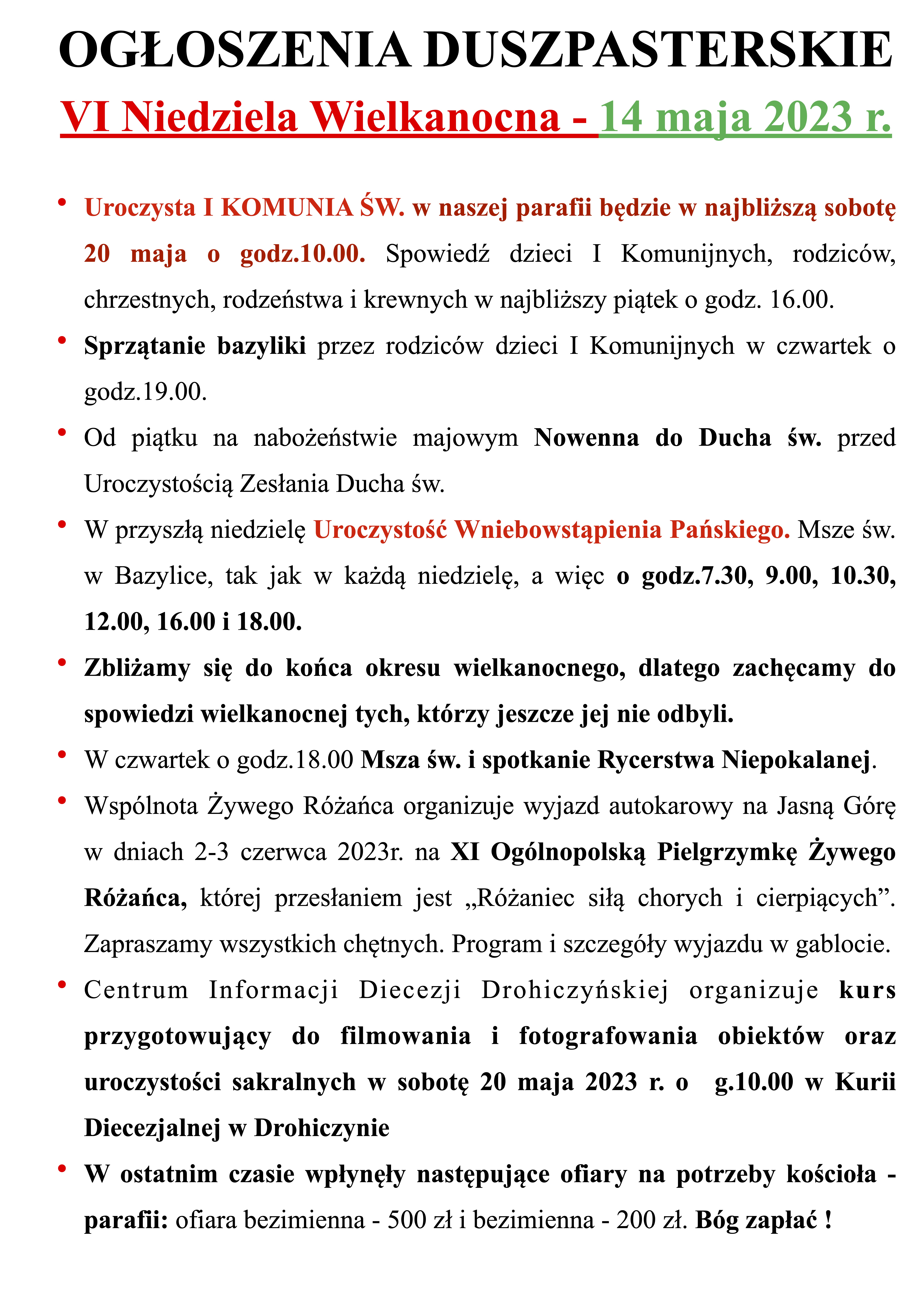 VI Niedziela Wielkanocna – 14 maja 2023 r.