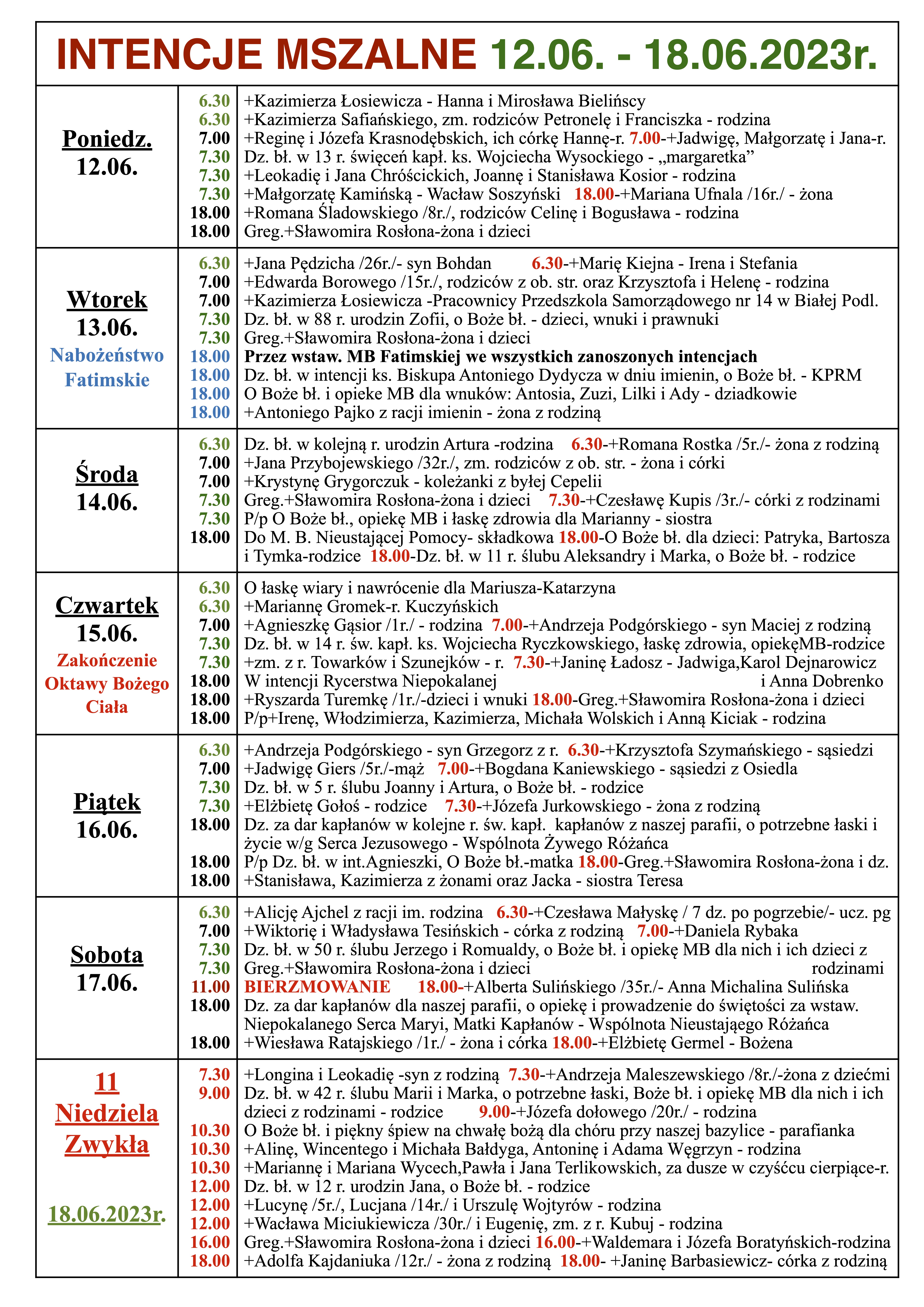 INTENCJE MSZALNE 12.06. – 18.06.2023r.
