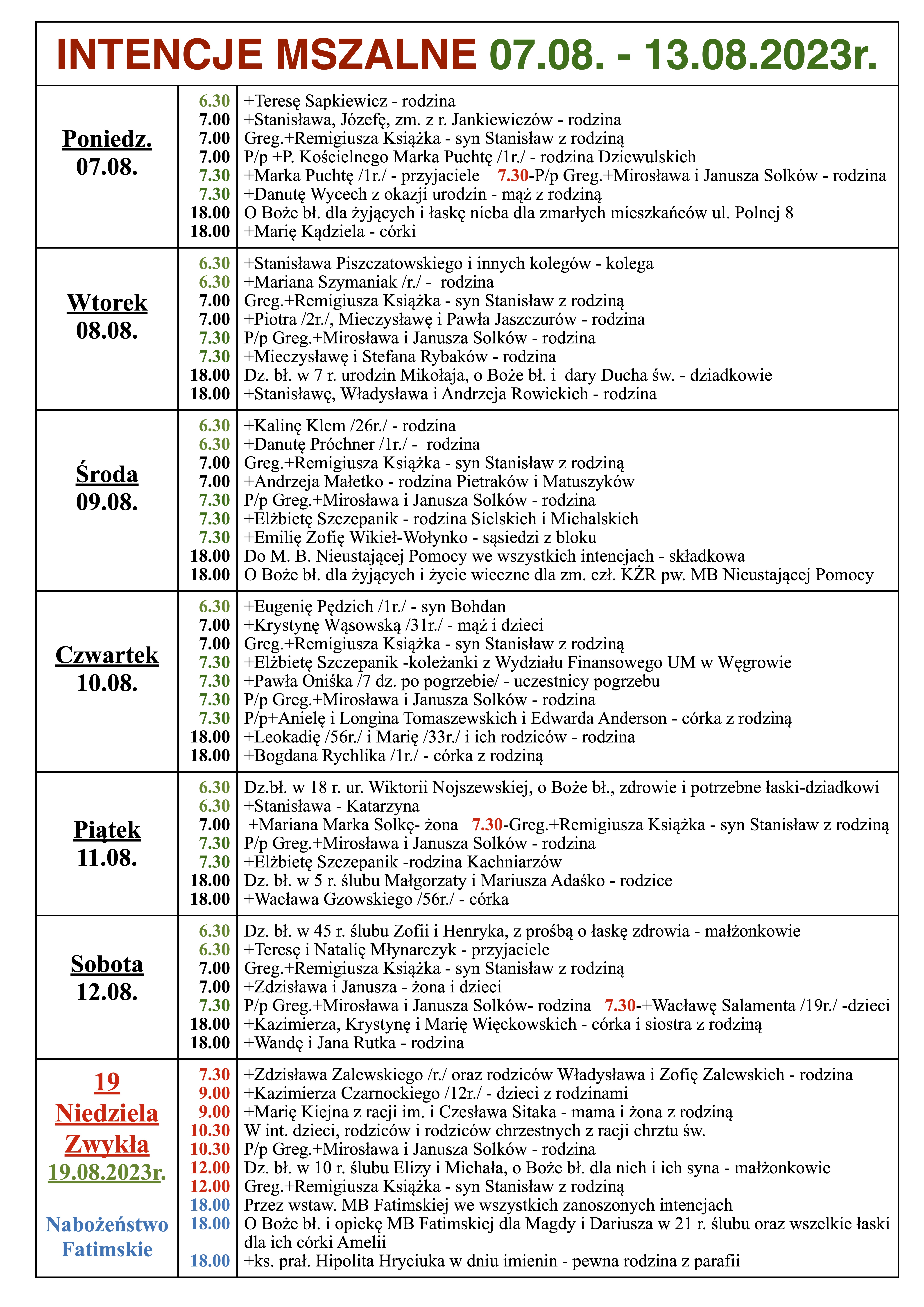 INTENCJE MSZALNE 14.08. – 20.08.2023r.