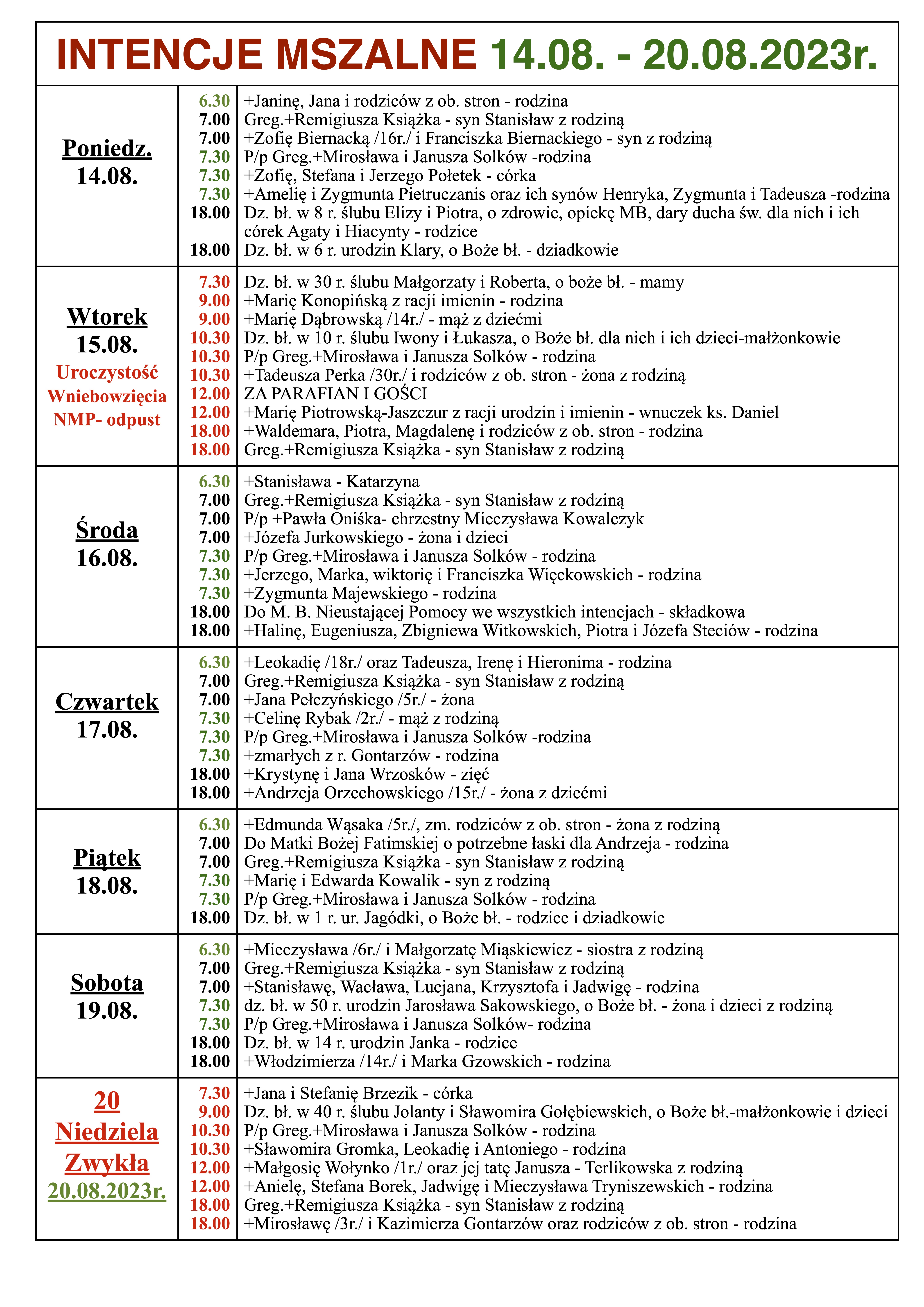 INTENCJE MSZALNE 14.08. – 20.08.2023r.