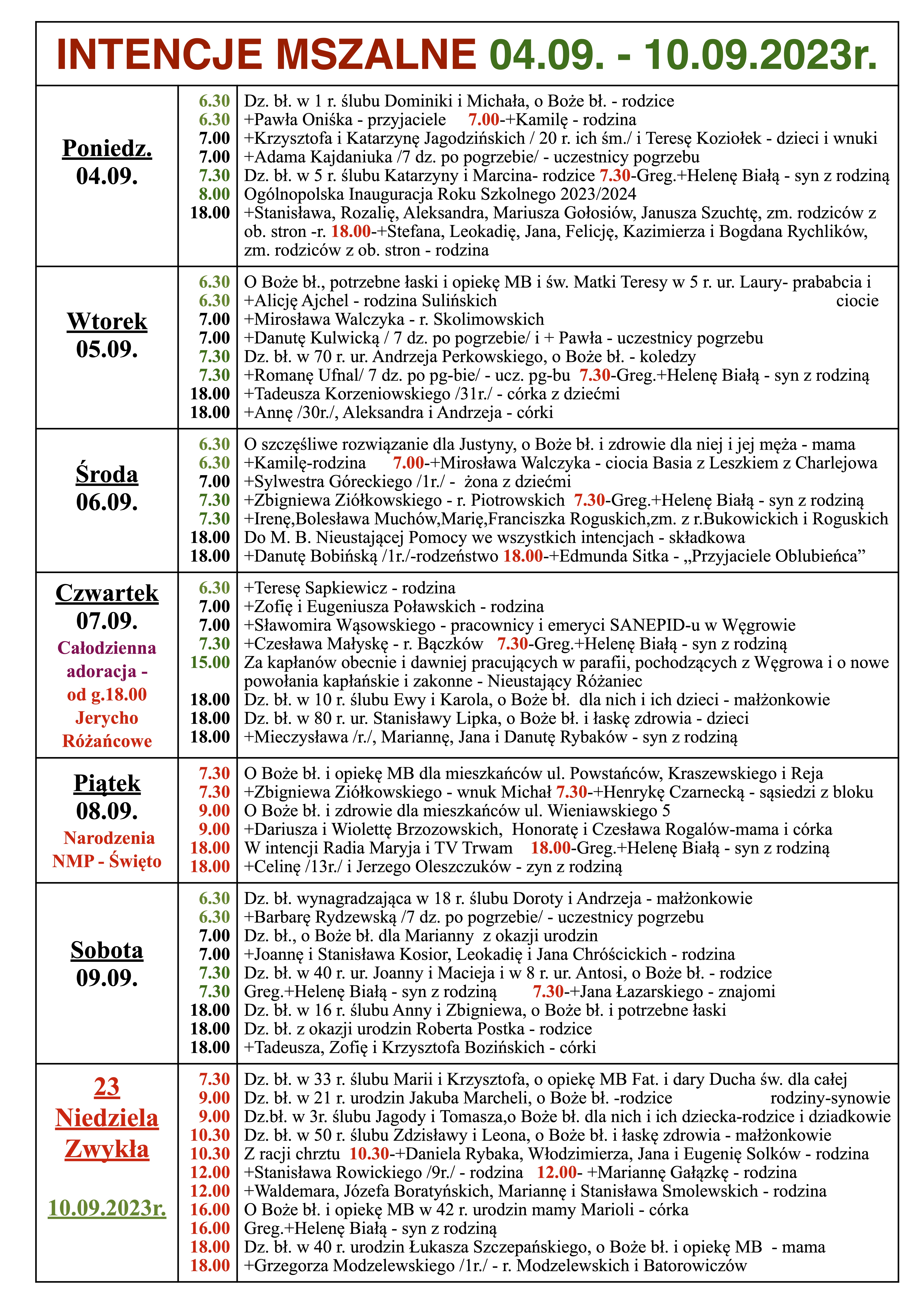 INTENCJE MSZALNE 04.09. – 10.09.2023r.