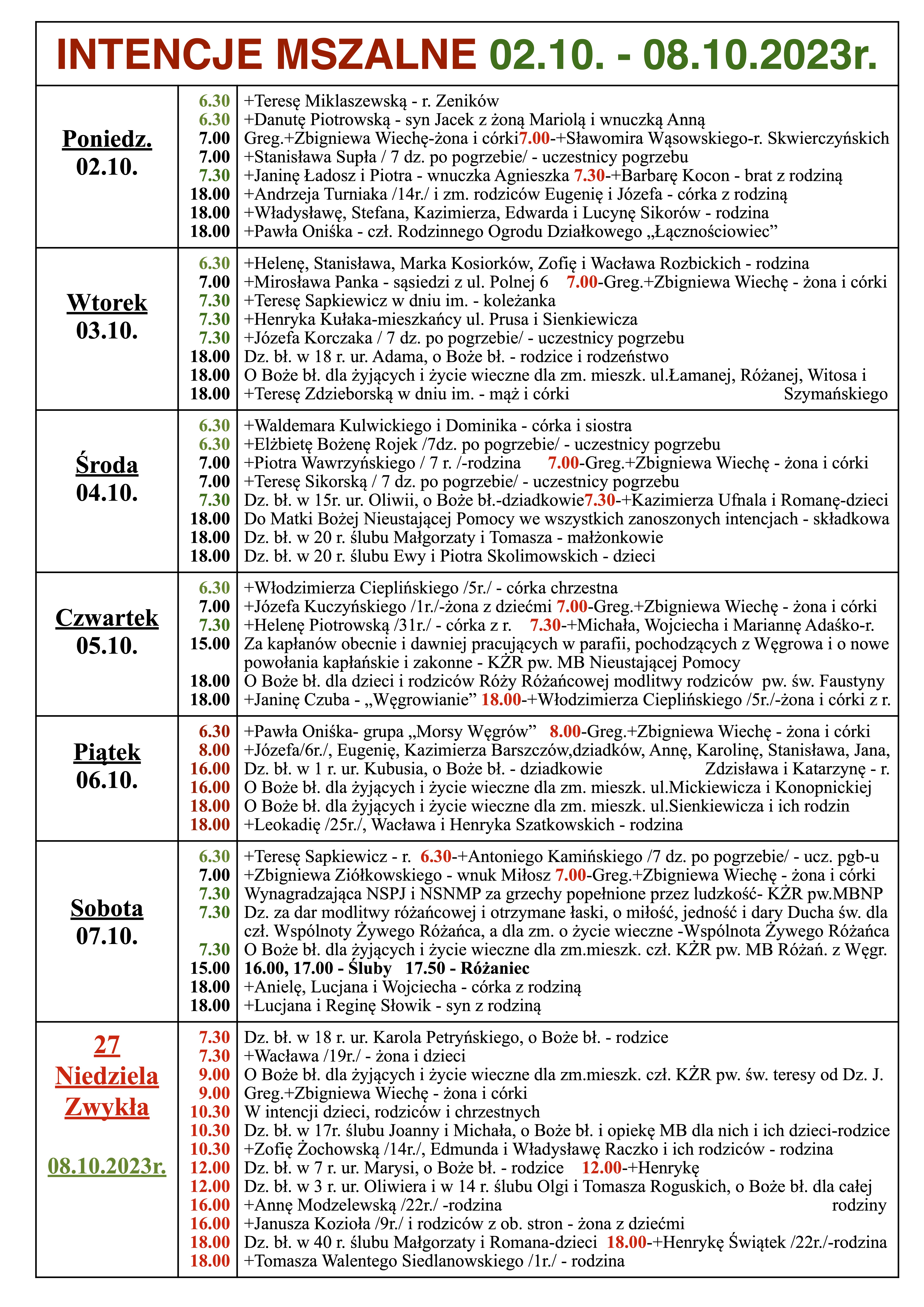 INTENCJE MSZALNE 02.10. – 08.10.2023r.