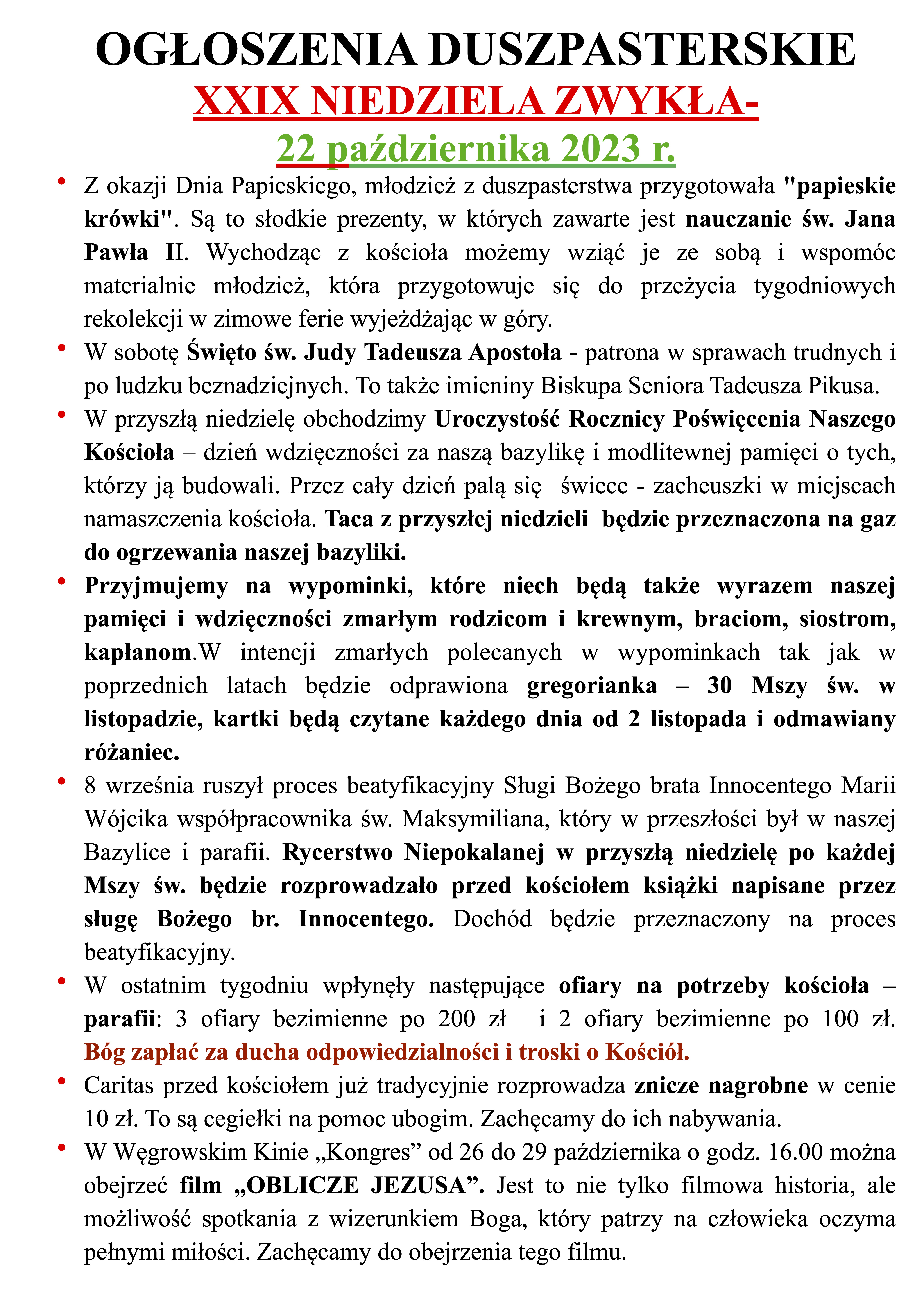 XXIX NIEDZIELA ZWYKŁA- 22 października 2023 r.