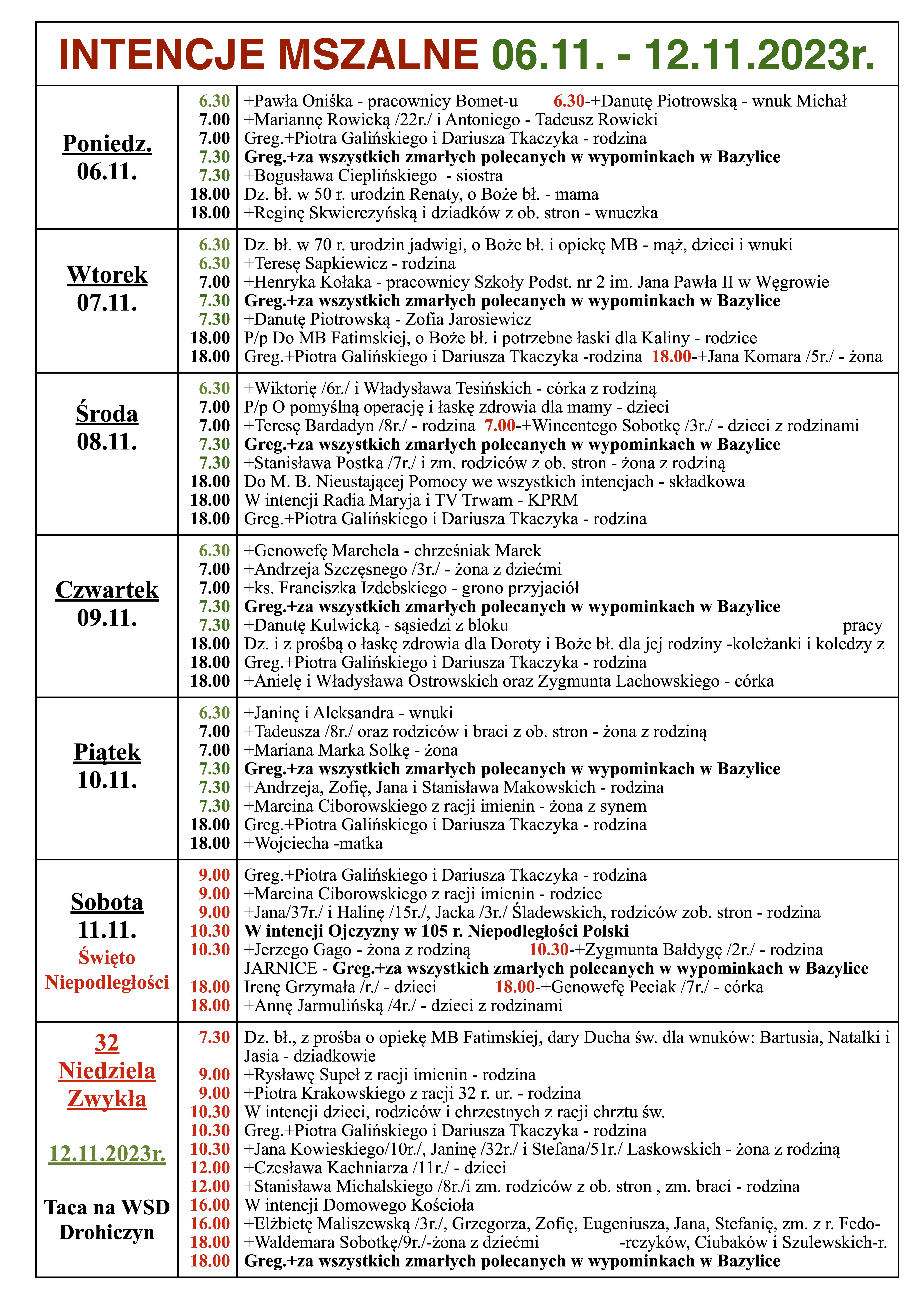 INTENCJE MSZALNE 06.11. – 12.11.2023r.