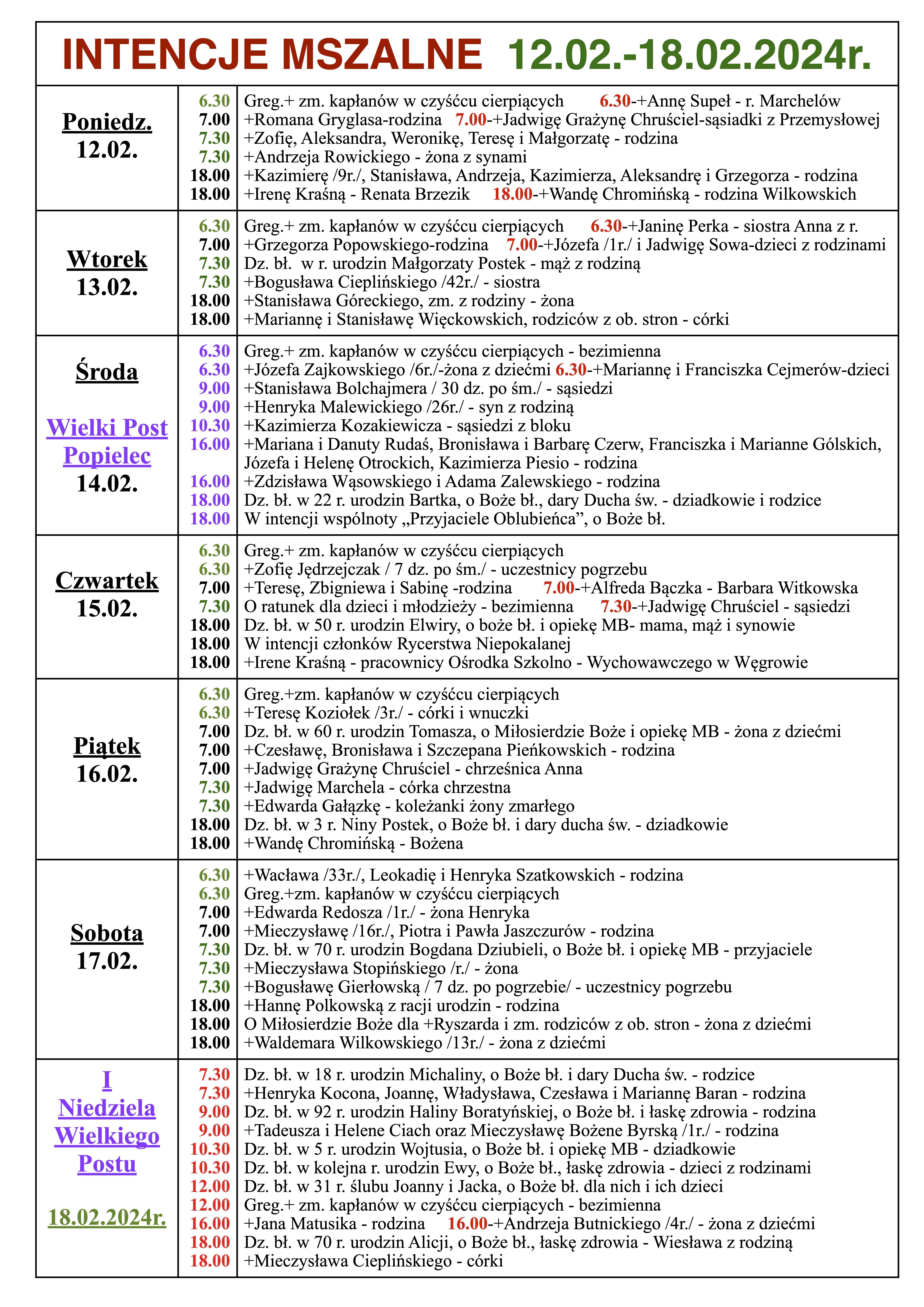 INTENCJE MSZALNE 12.02.-18.02.2024r.