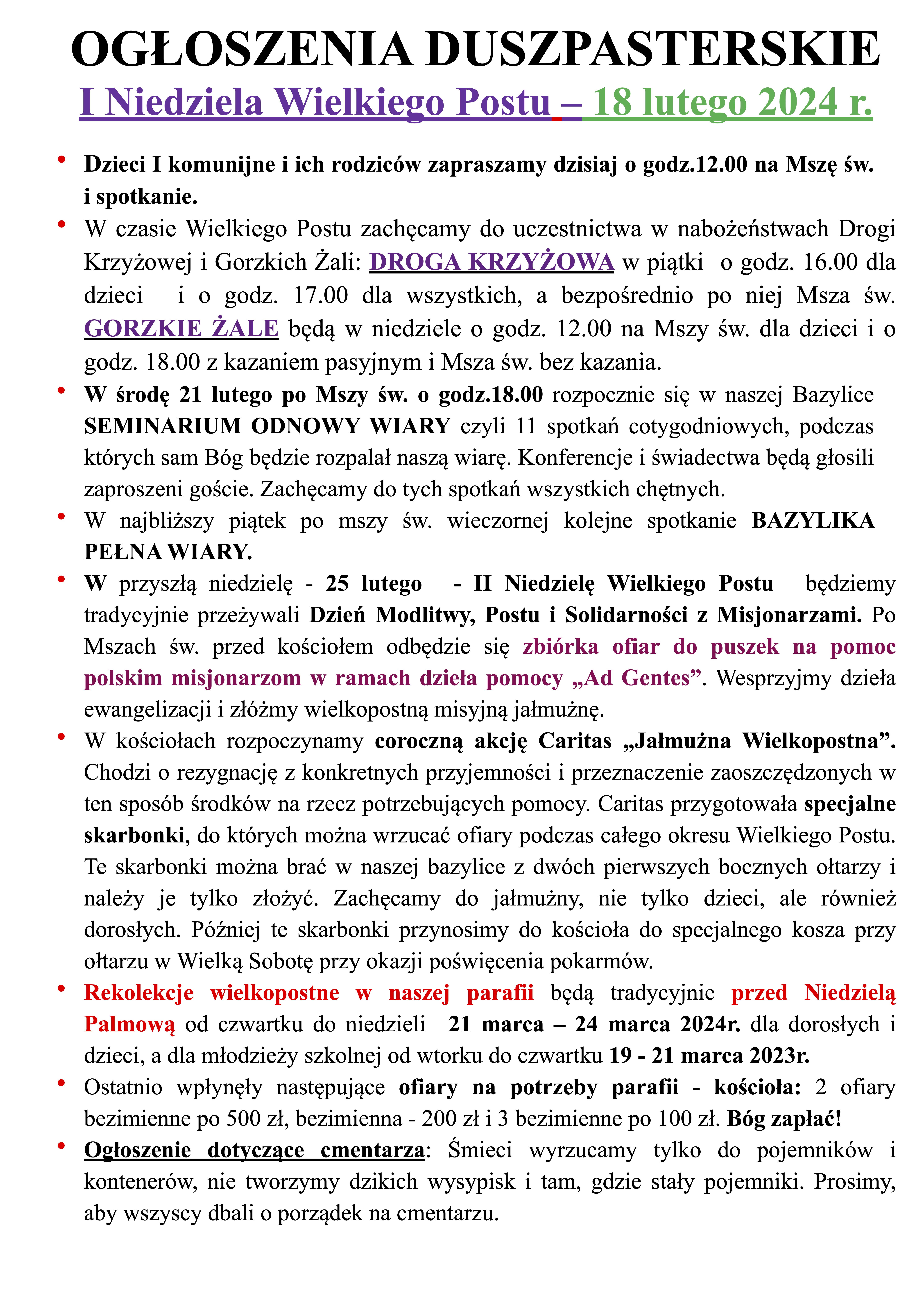 I Niedziela Wielkiego Postu – 18 lutego 2024 r.