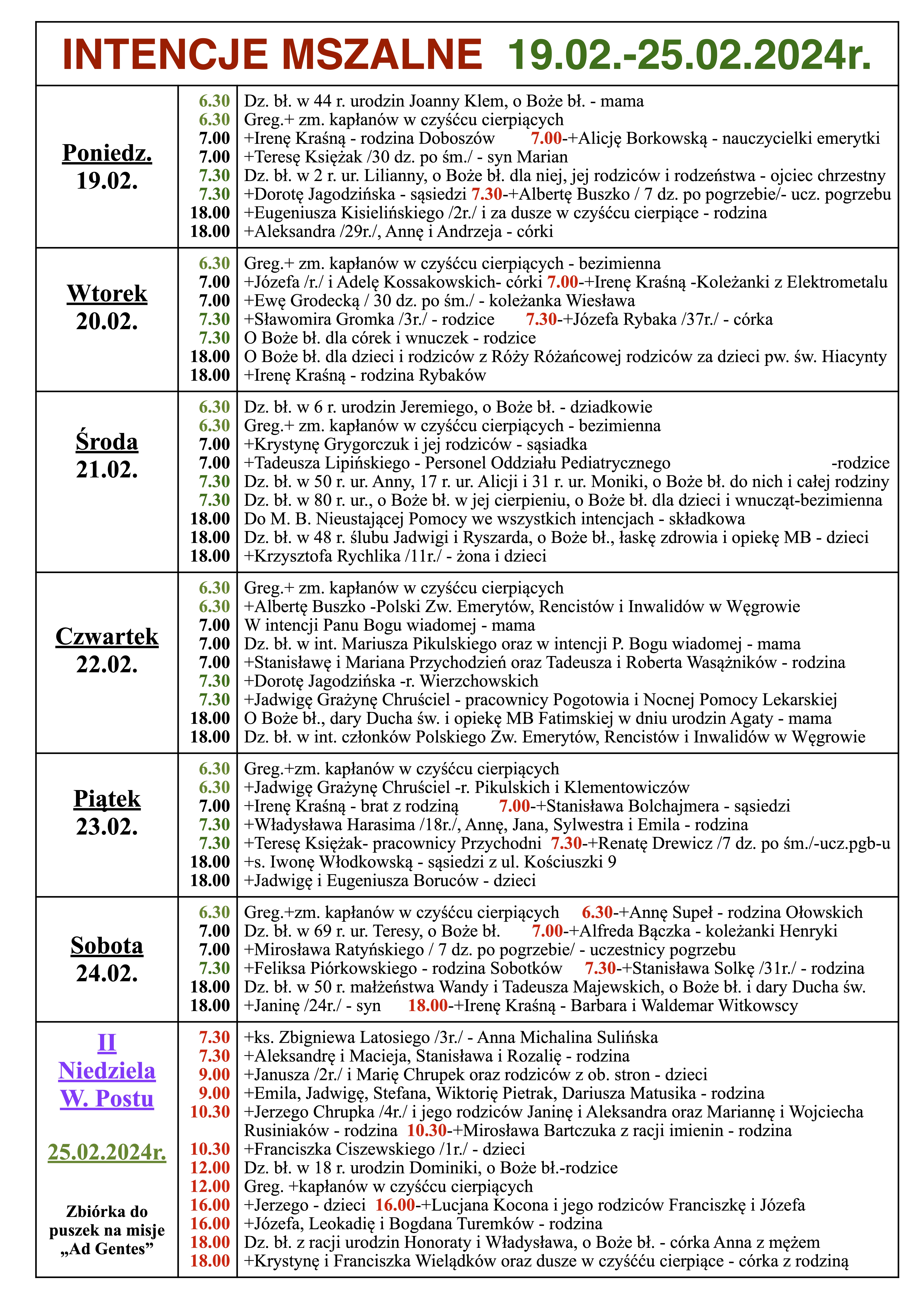 INTENCJE MSZALNE 19.02.-25.02.2024r.