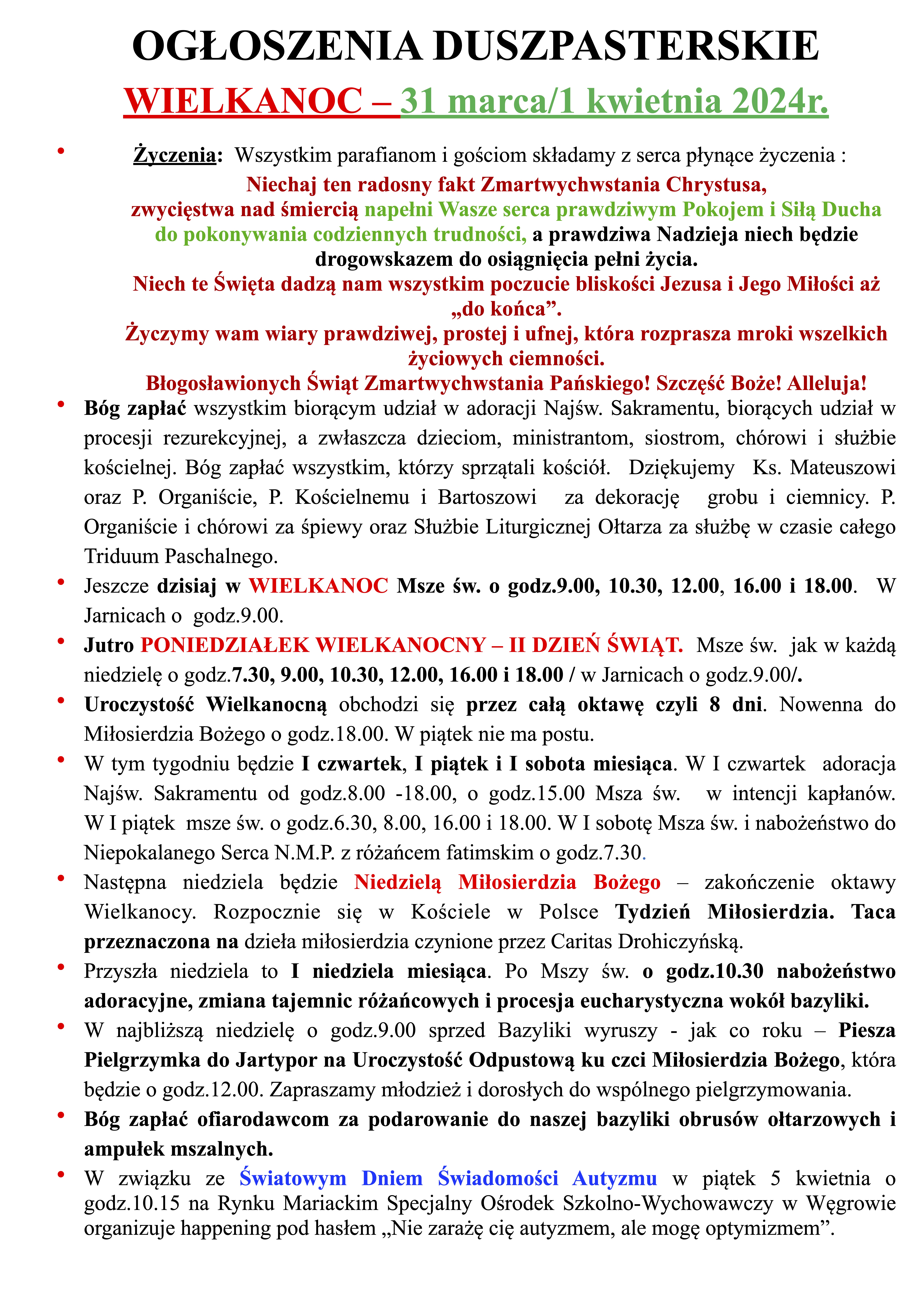 Życzenia wielkanocne i ogłoszenia – WIELKANOC – 31 marca/1 kwietnia 2024r.