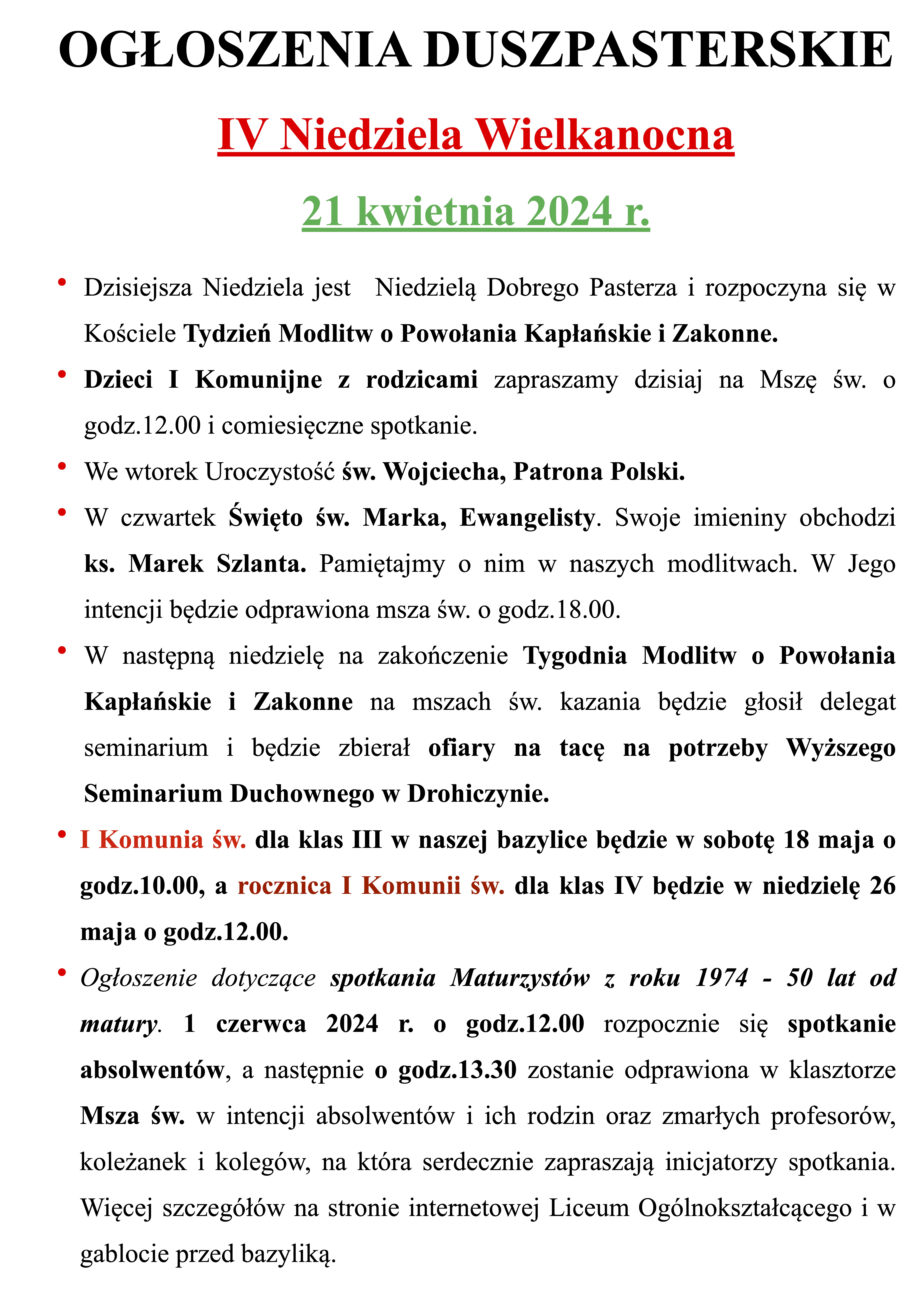 IV Niedziela Wielkanocna – 21 kwietnia 2024 r.