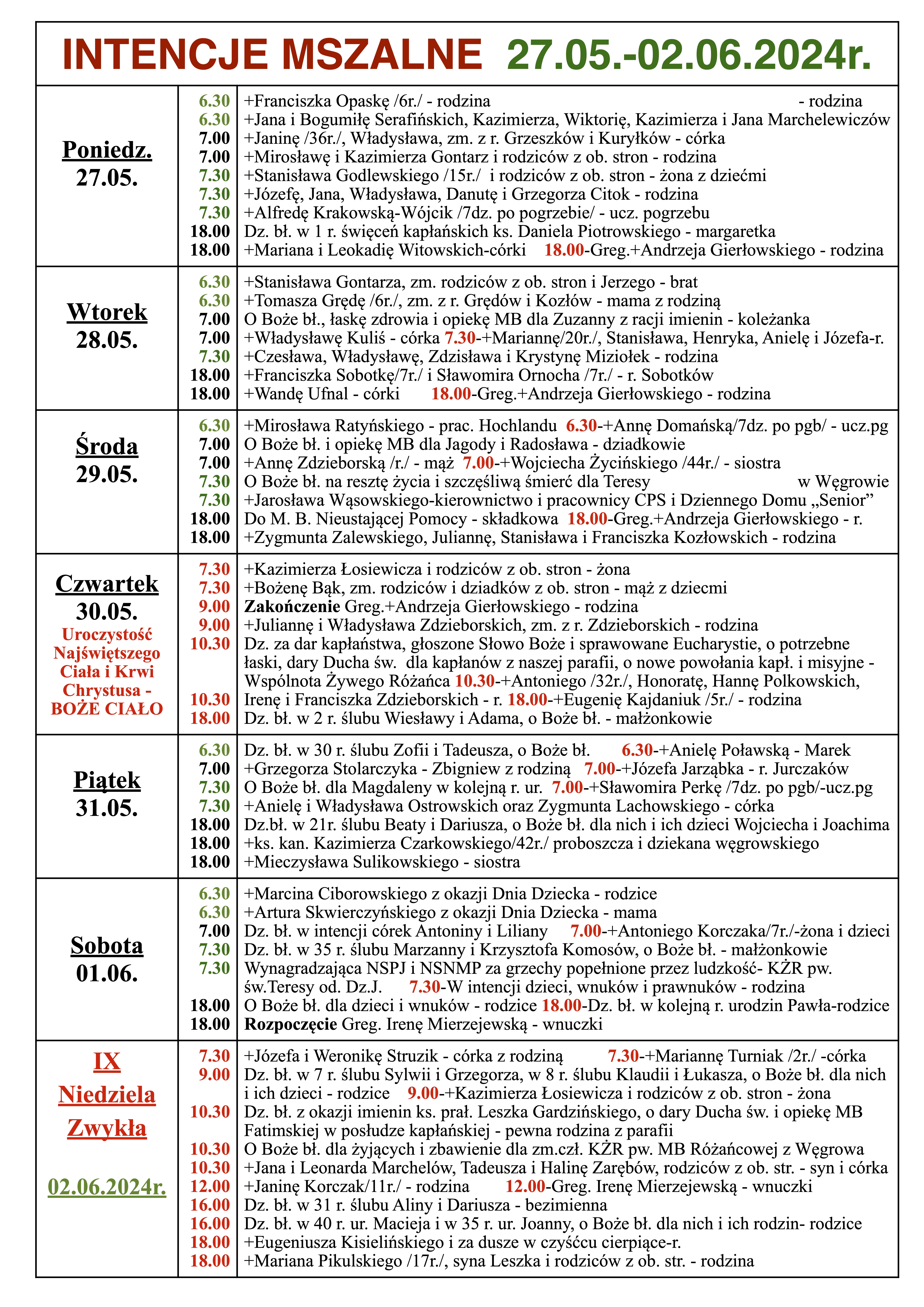 INTENCJE MSZALNE 27.05.-02.06.2024r.