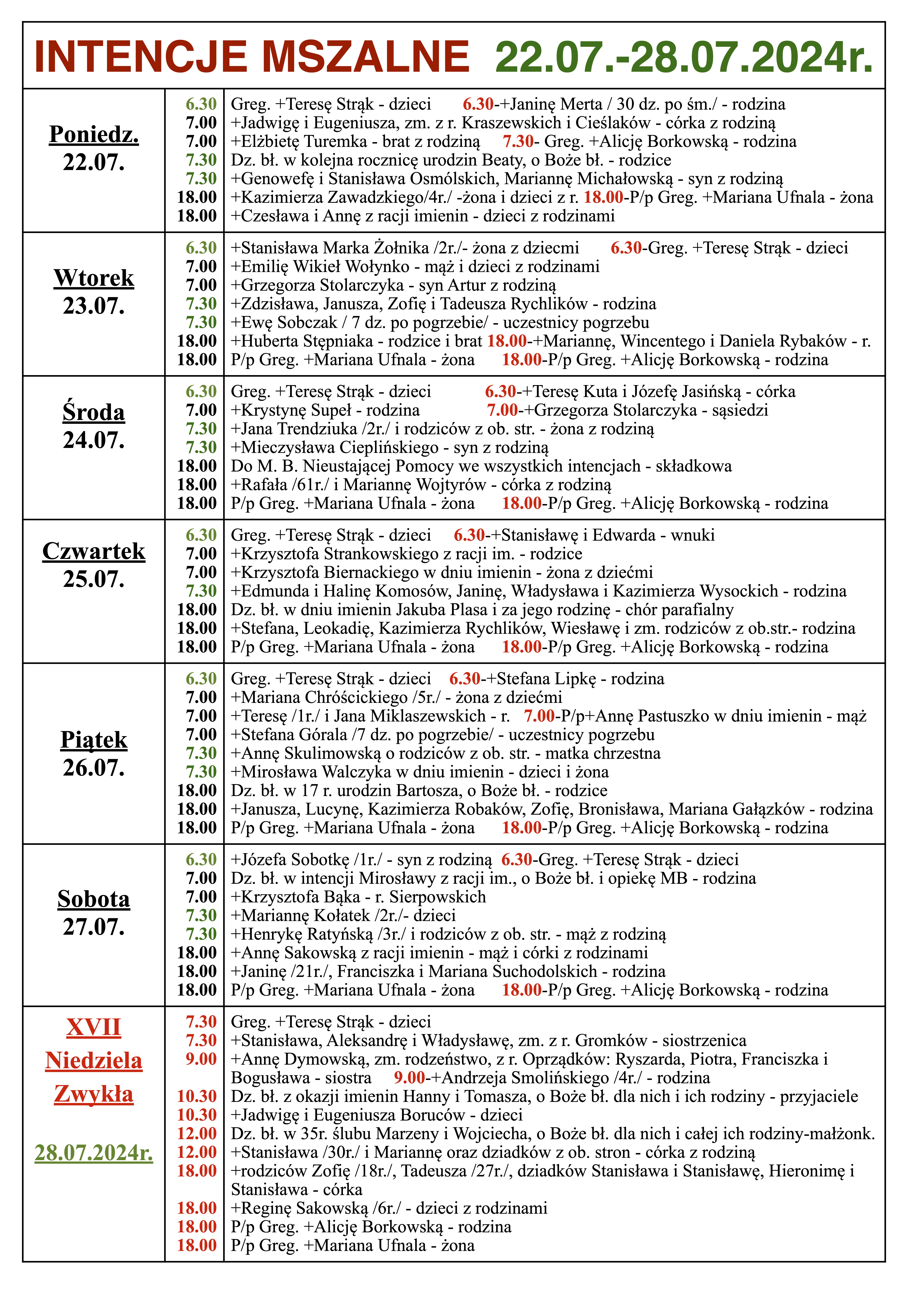 INTENCJE MSZALNE 22.07.-28.07.2024r.