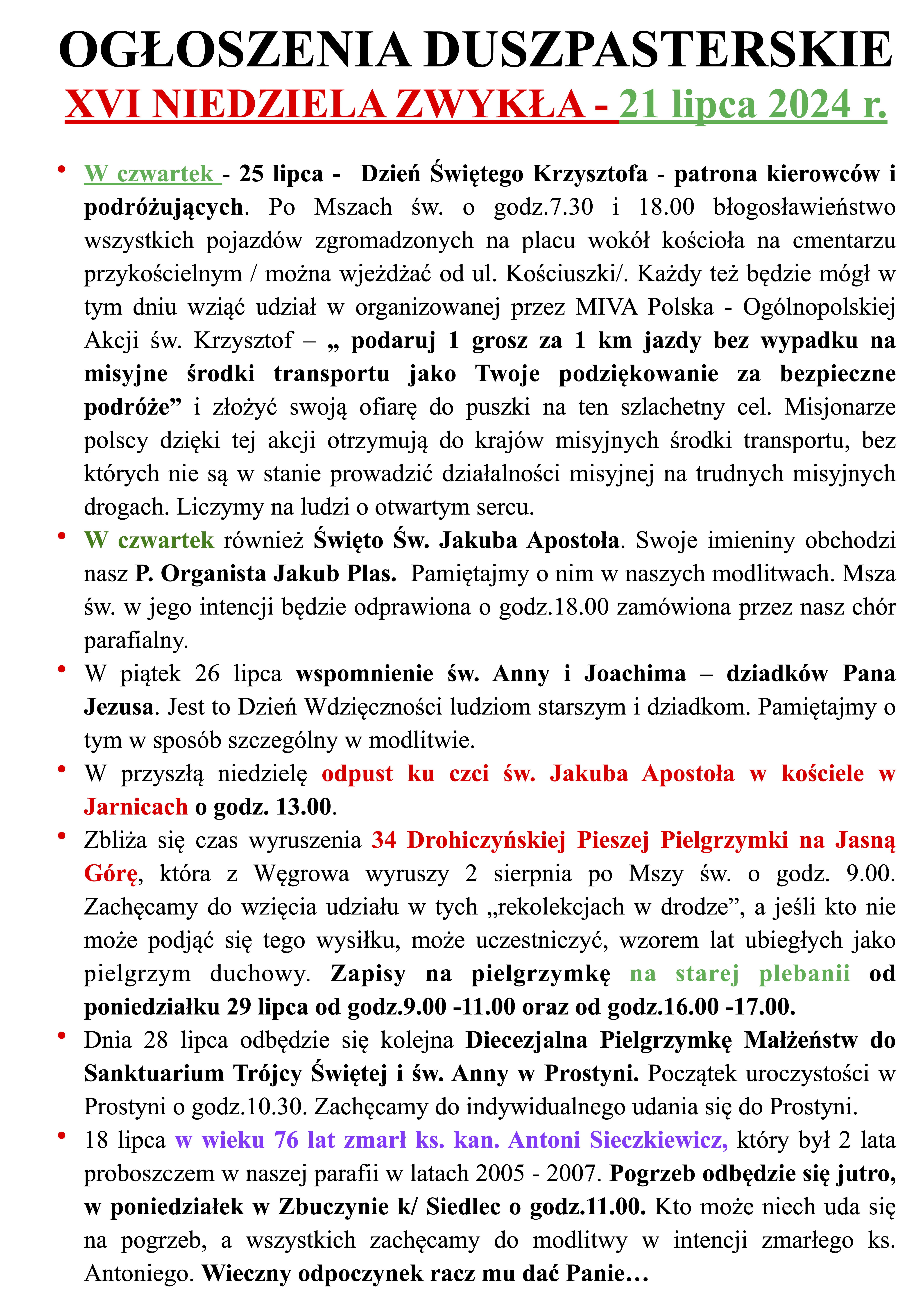 INTENCJE MSZALNE 29.07.-04.07.2024r.