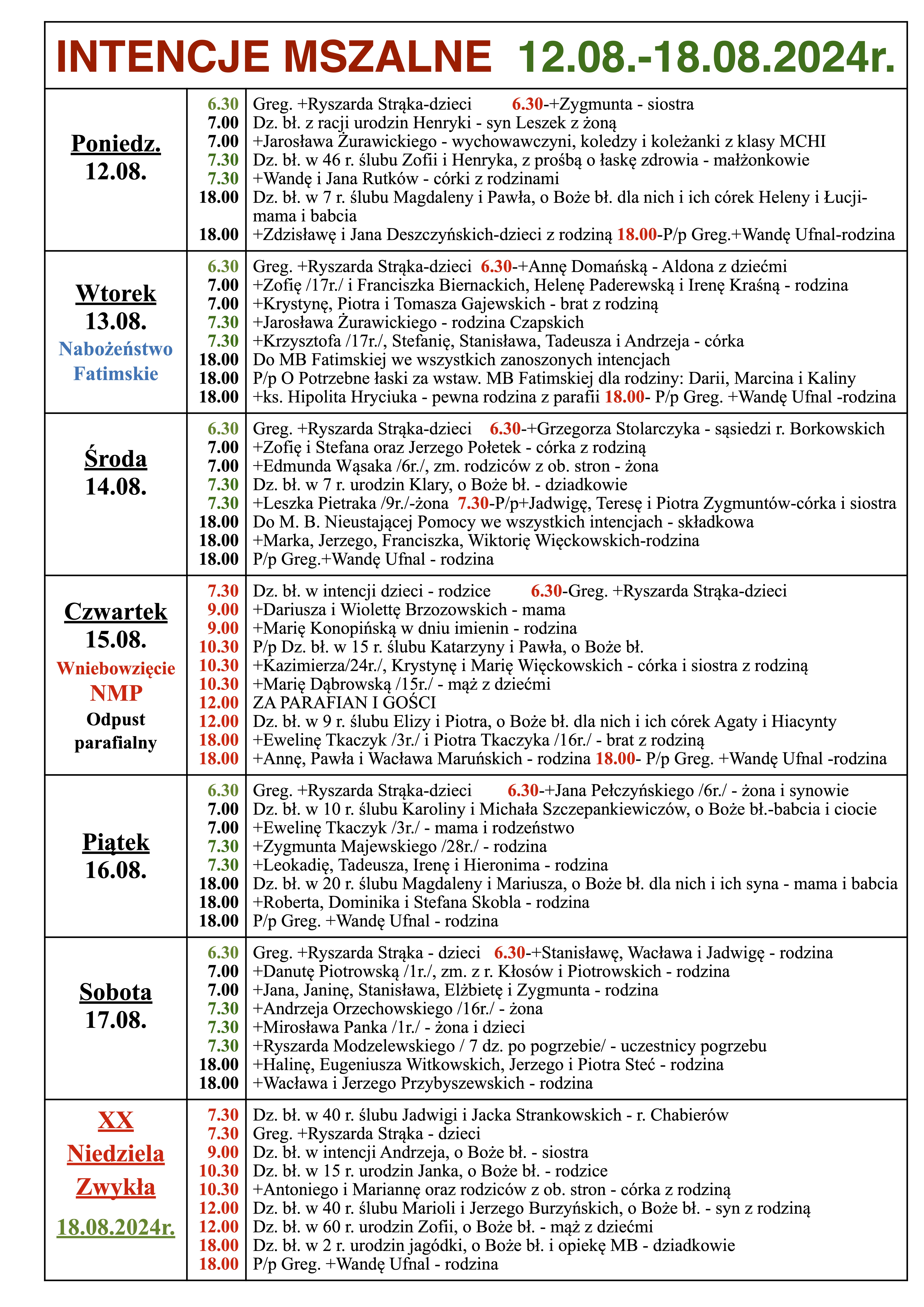 INTENCJE MSZALNE 12.08.-18.08.2024r.