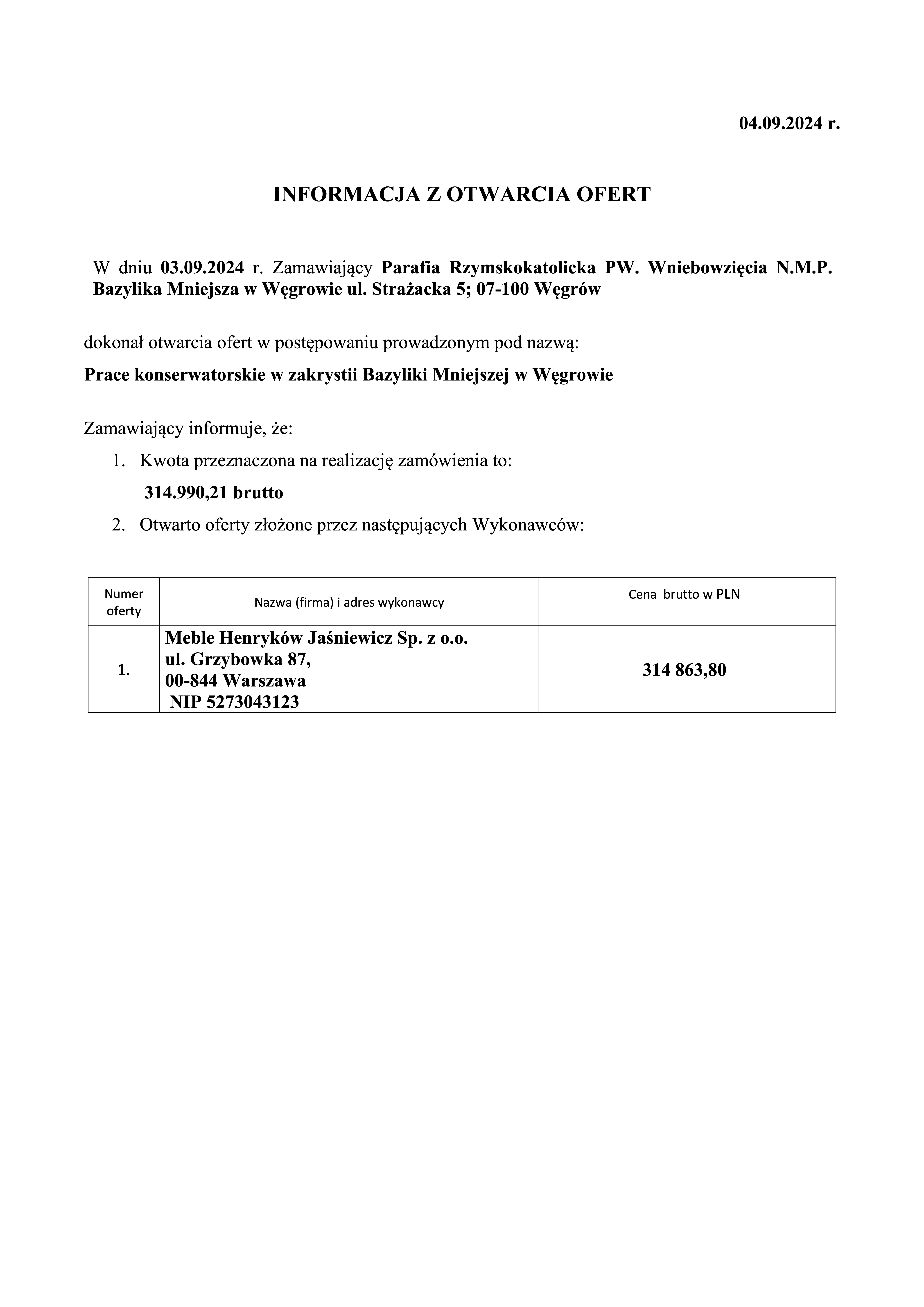 INFORMACJA Z OTWARCIA OFERT – Prace konserwatorskie w zakrystii Bazyliki Mniejszej w Węgrowie przez Ks. Proboszcz / 1 rok temu