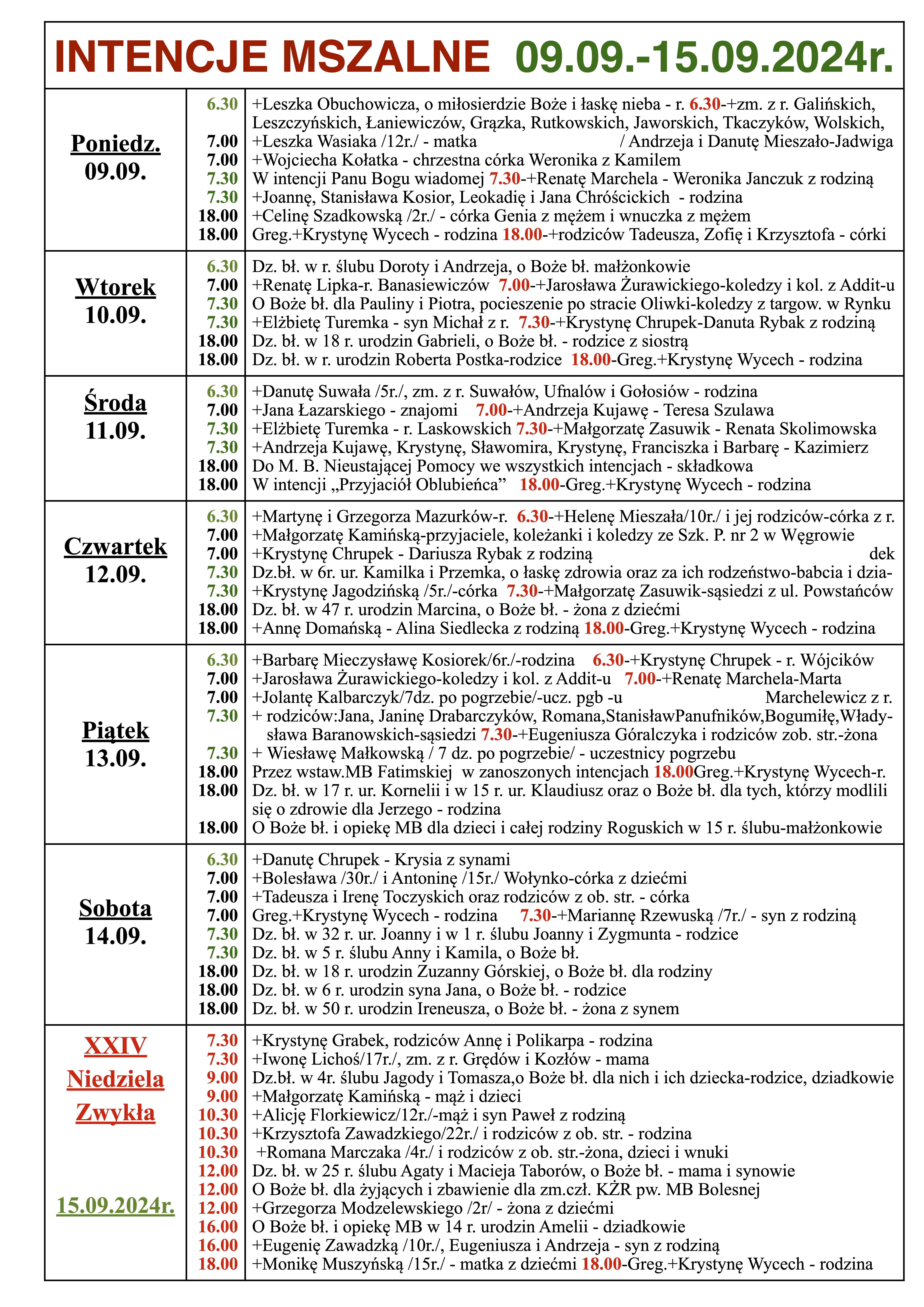 INTENCJE MSZALNE 09.09.-15.09.2024r.