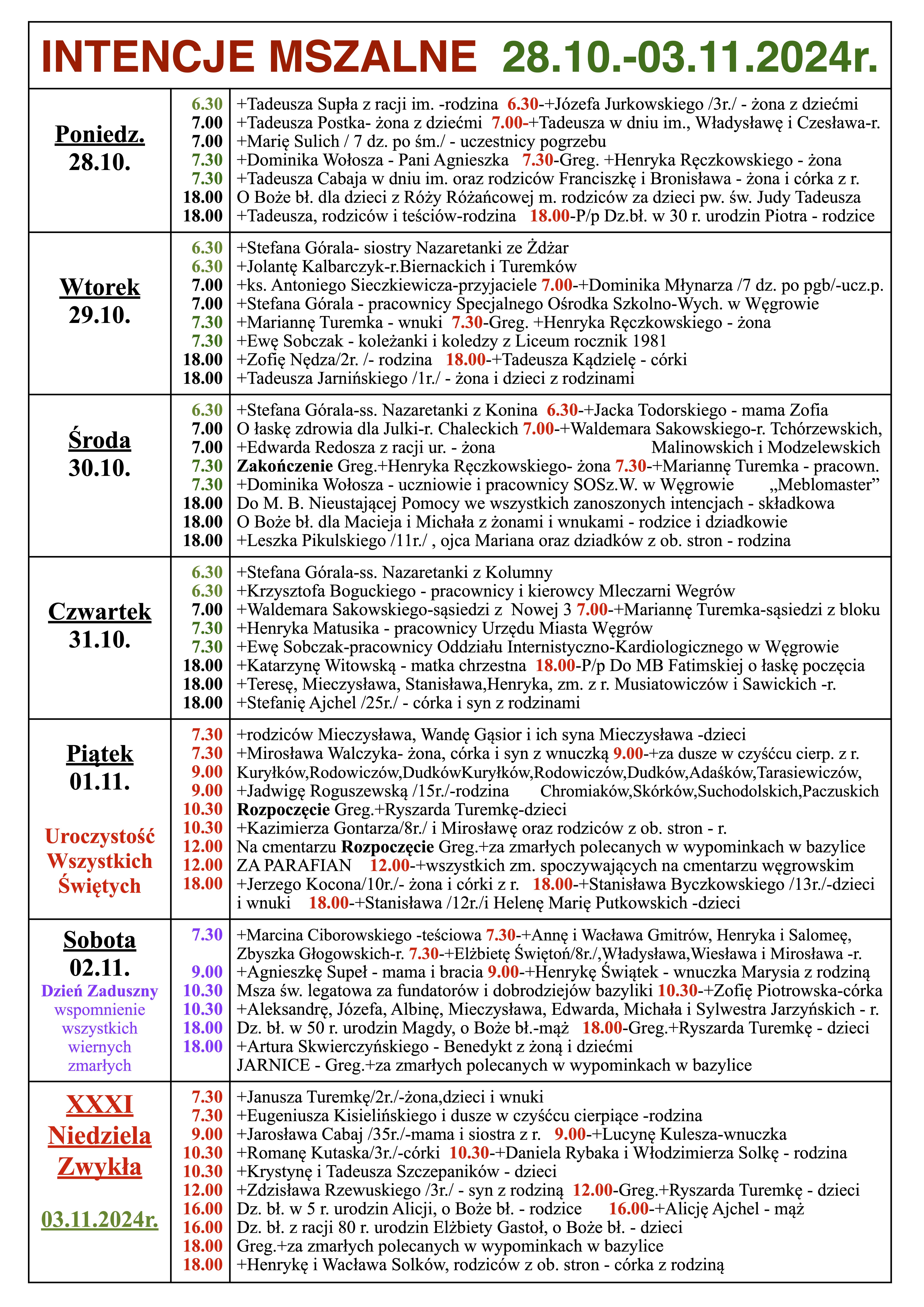 INTENCJE MSZALNE 28.10.-03.11.2024r.