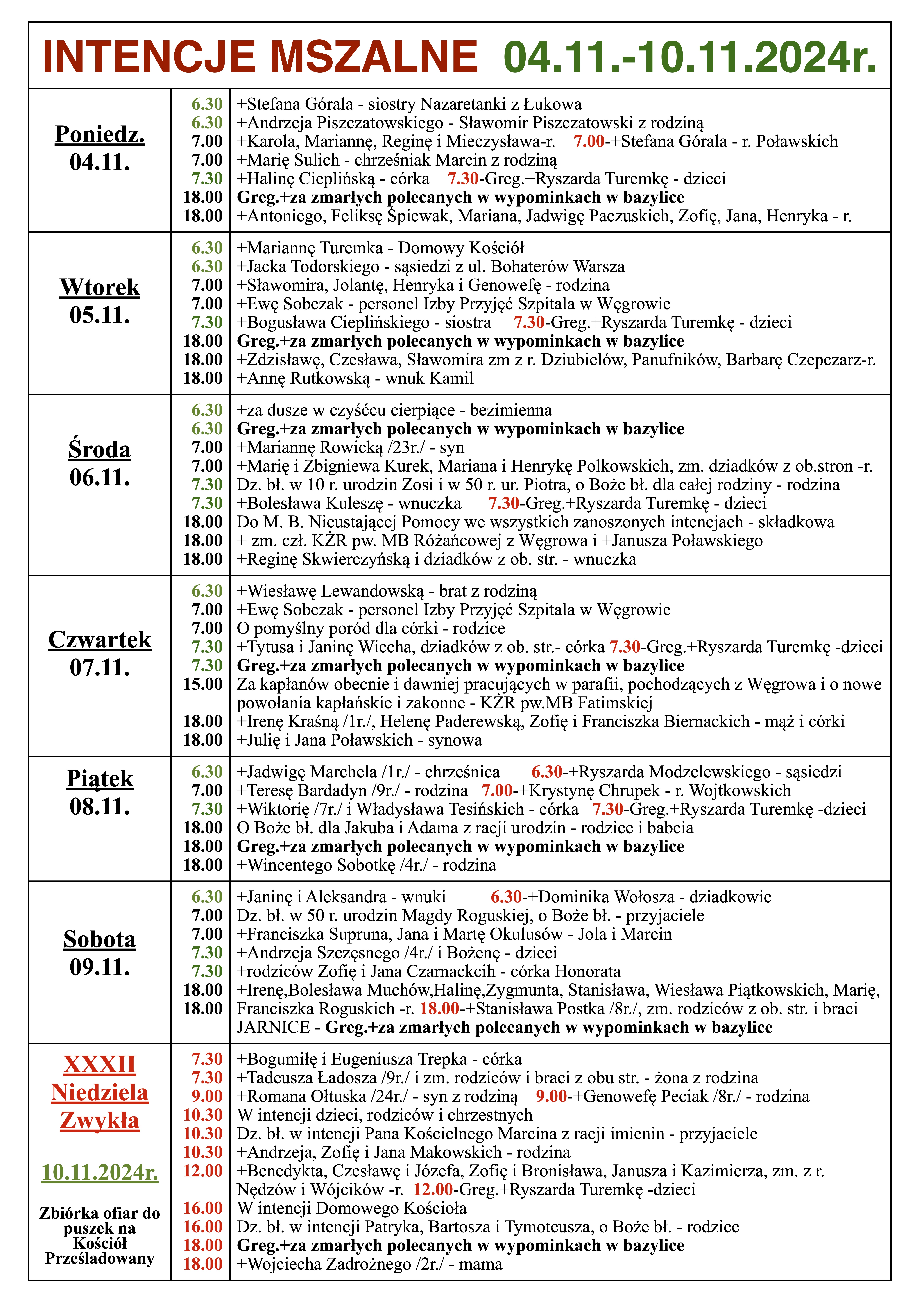 INTENCJE MSZALNE 04.11.-10.11.2024r.