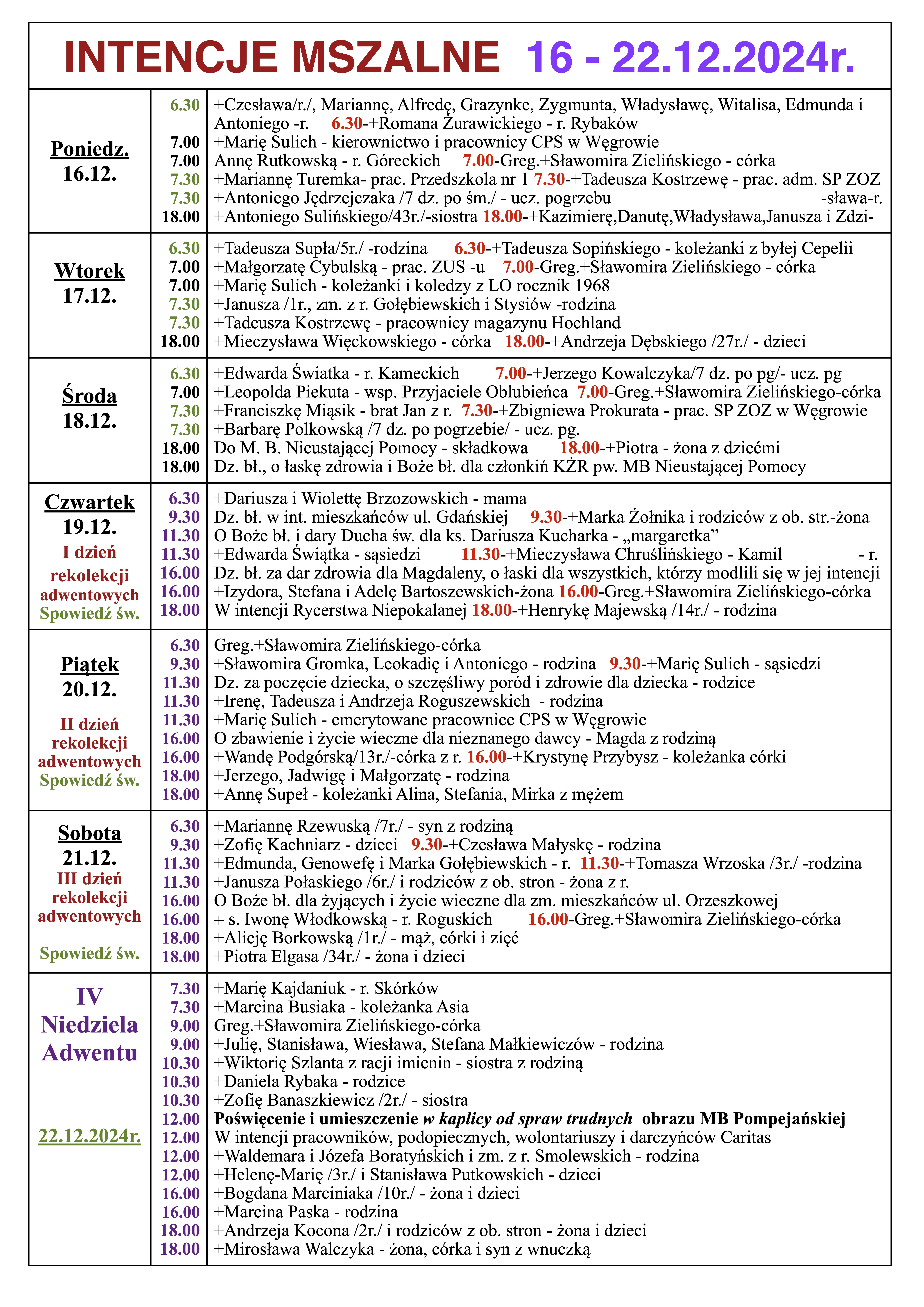 INTENCJE MSZALNE 16 – 22.12.2024r.