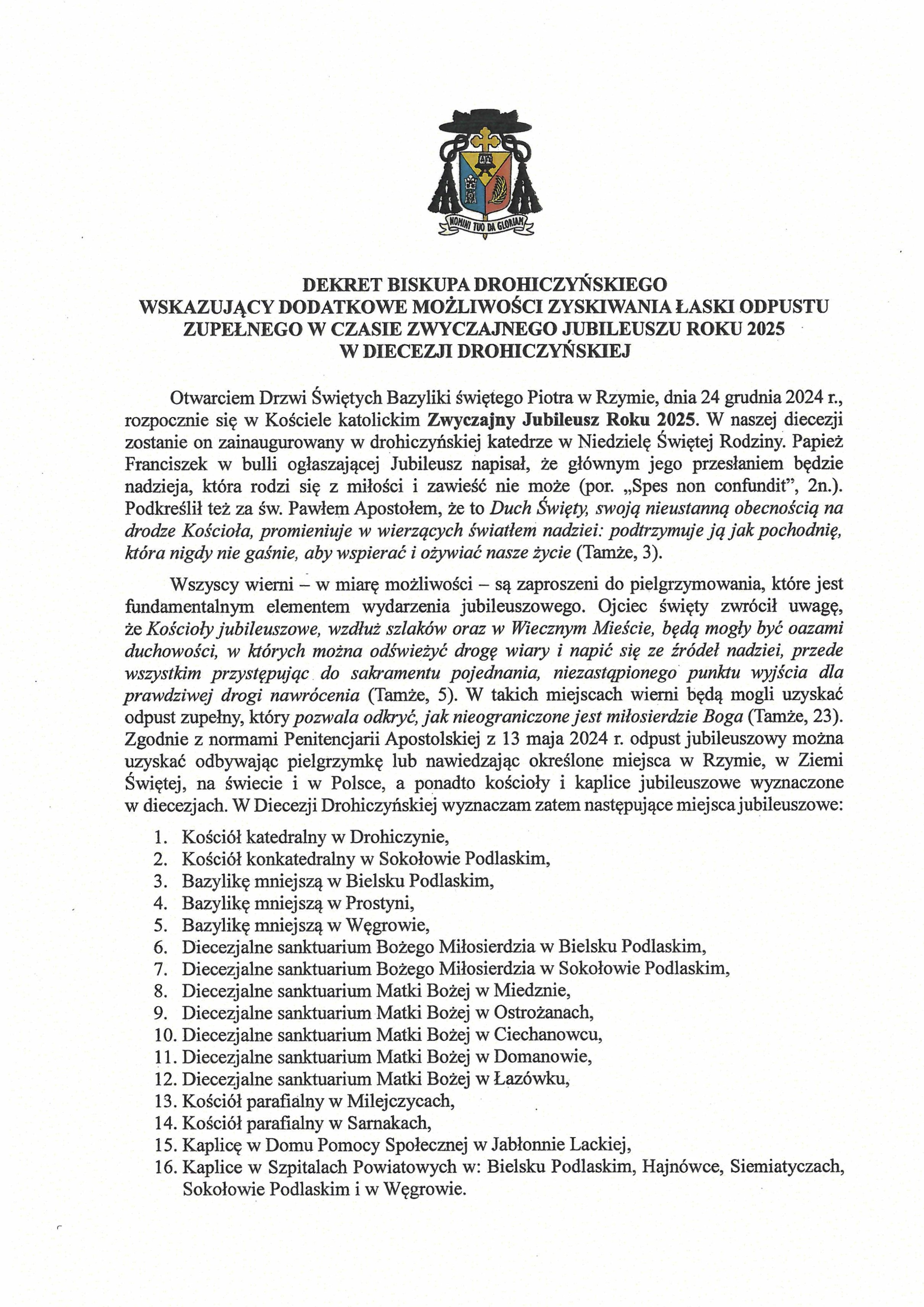 Dekret Biskupa Drohiczyńskiego wskazujący dodatkowe możliwości zyskiwania łaski odpustu zupełnego w czasie Zwyczajnego Jubileuszu Roku 2025 w diecezji drohiczyńskiej przez Ks. Proboszcz / 11 miesięcy temu