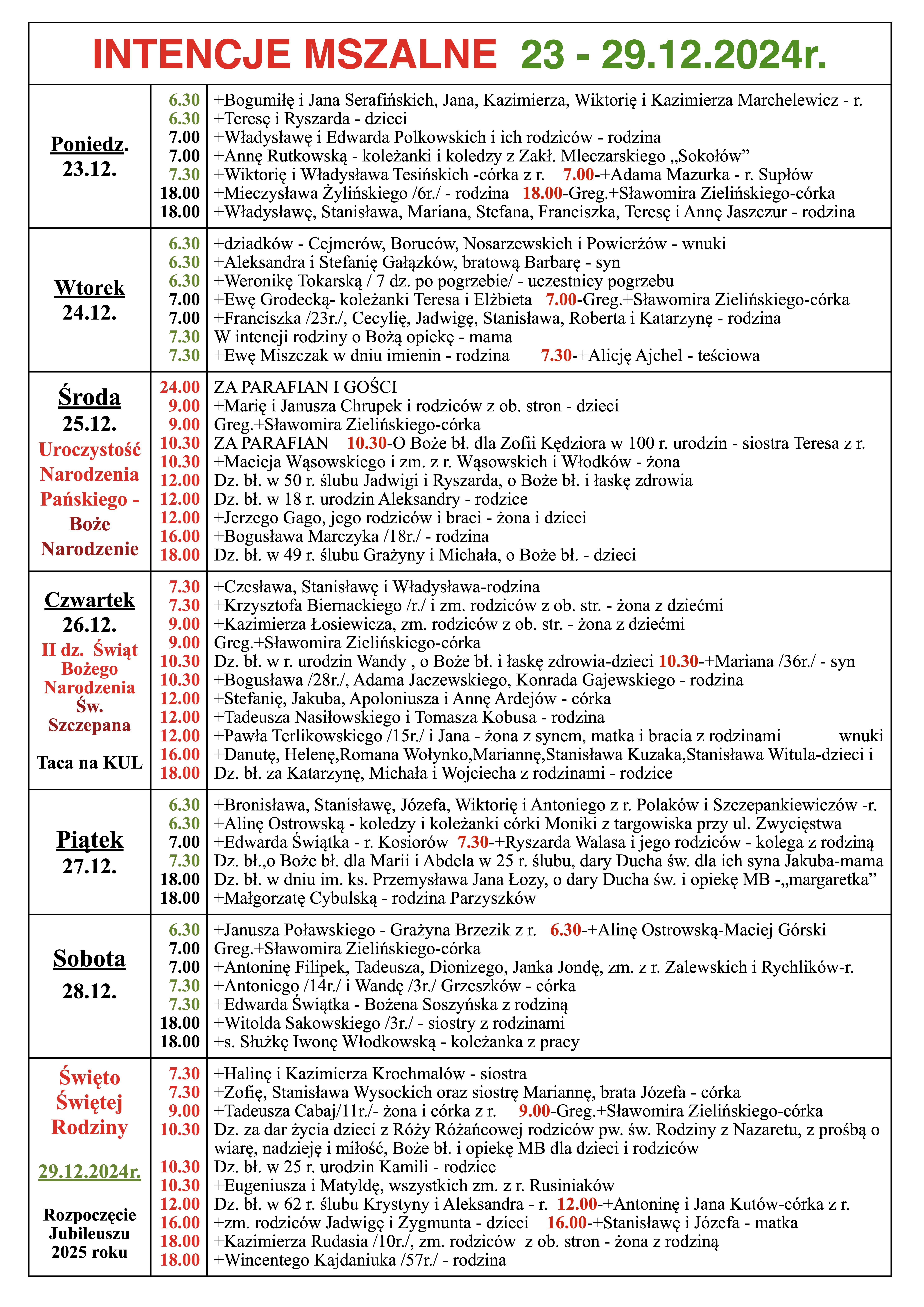 INTENCJE MSZALNE 23 – 29.12.2024r.