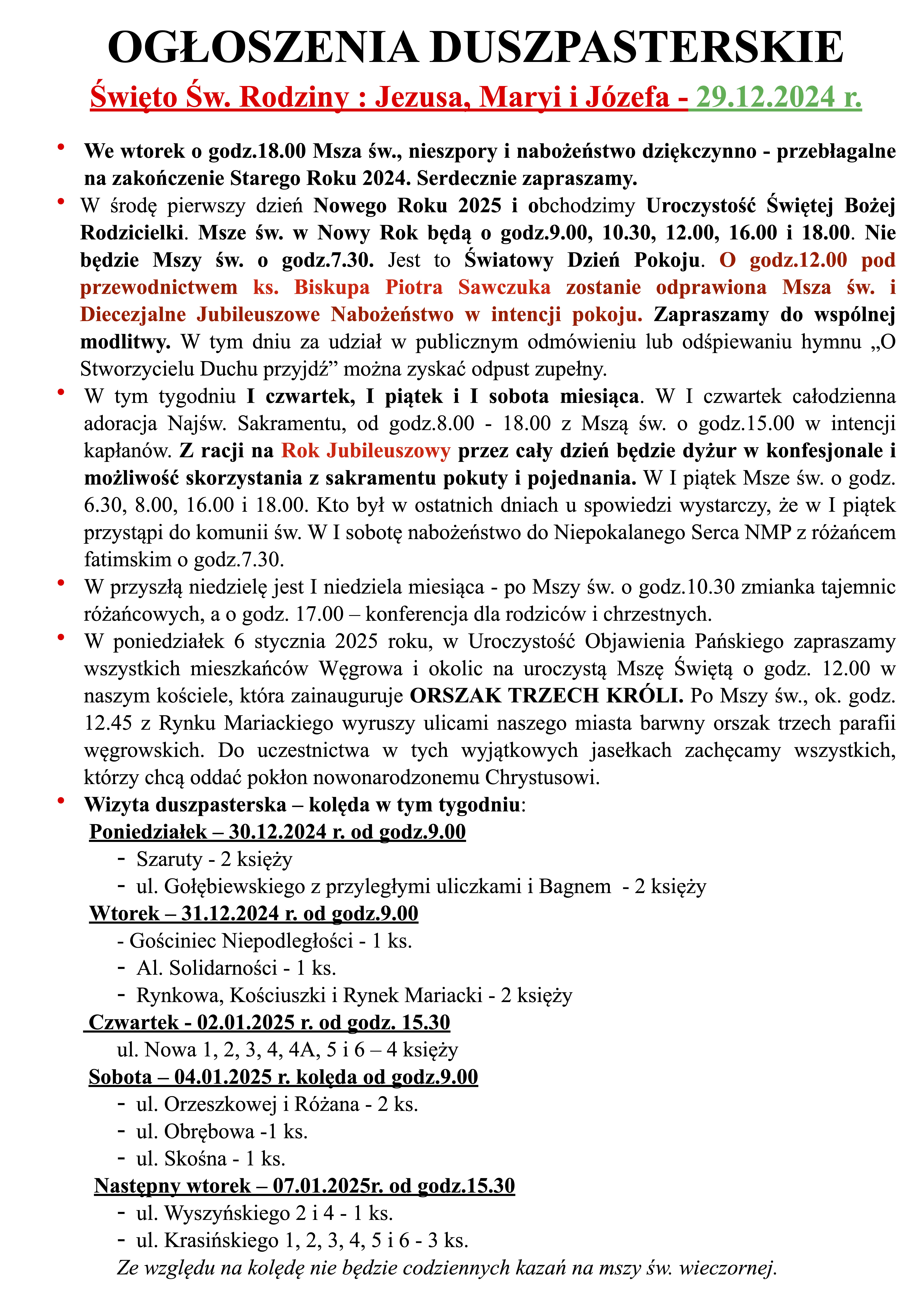 Święto Św. Rodziny : Jezusa, Maryi i Józefa – 29.12.2024 r. Rozpoczęcie Roku Jubileuszowego 2025