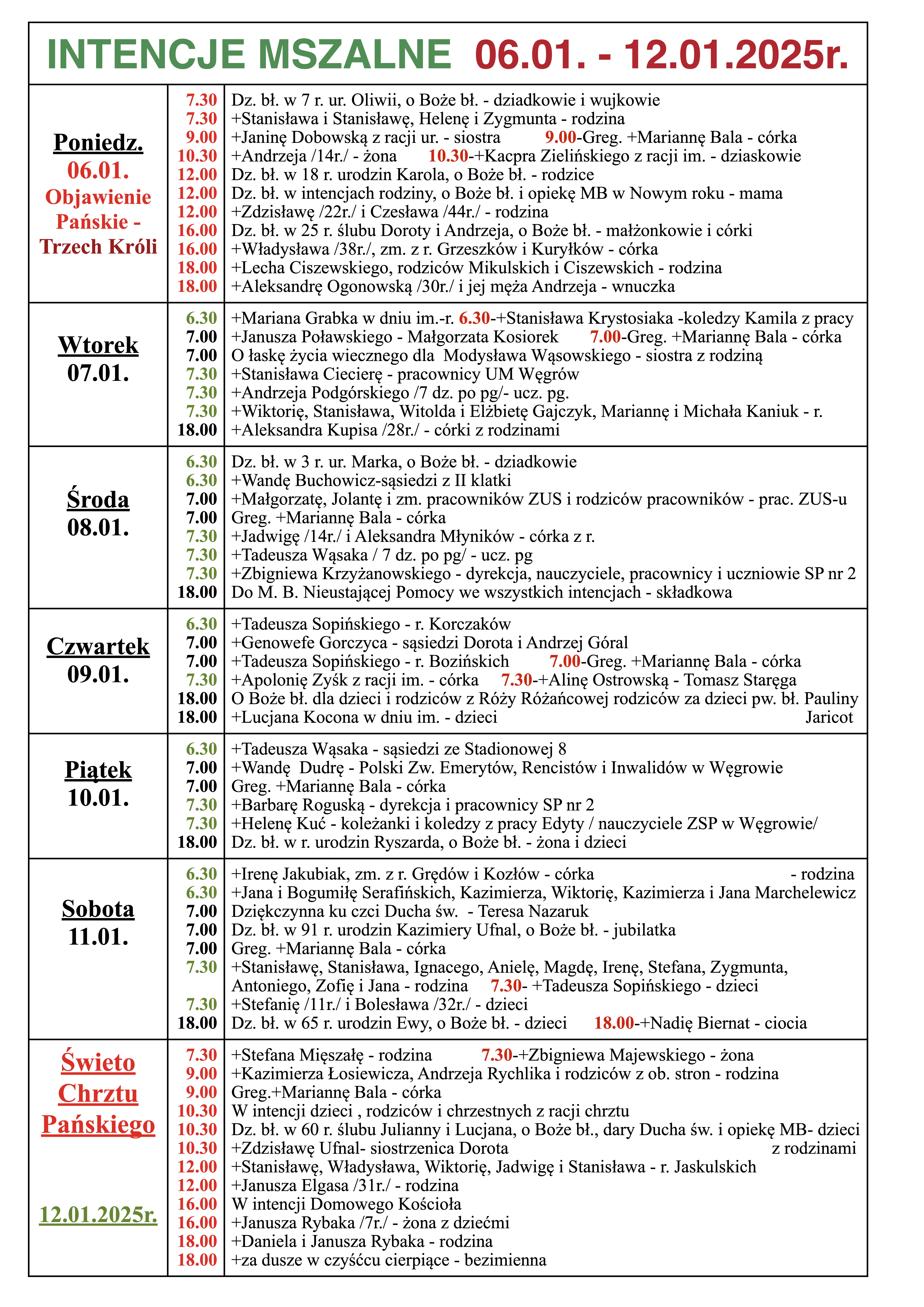 INTENCJE MSZALNE 06.01. – 12.01.2025r.