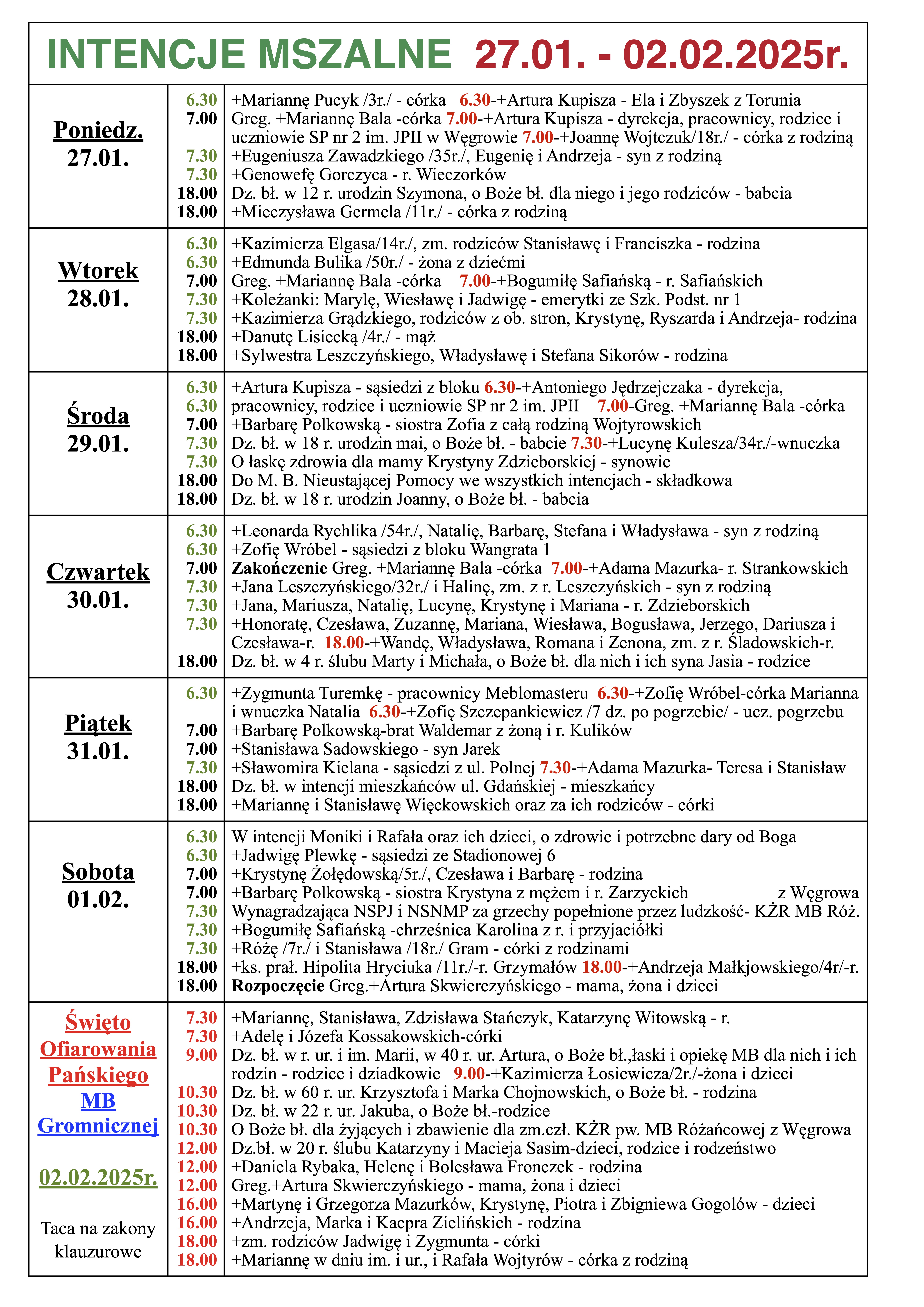 INTENCJE MSZALNE 27.01. – 02.02.2025r.