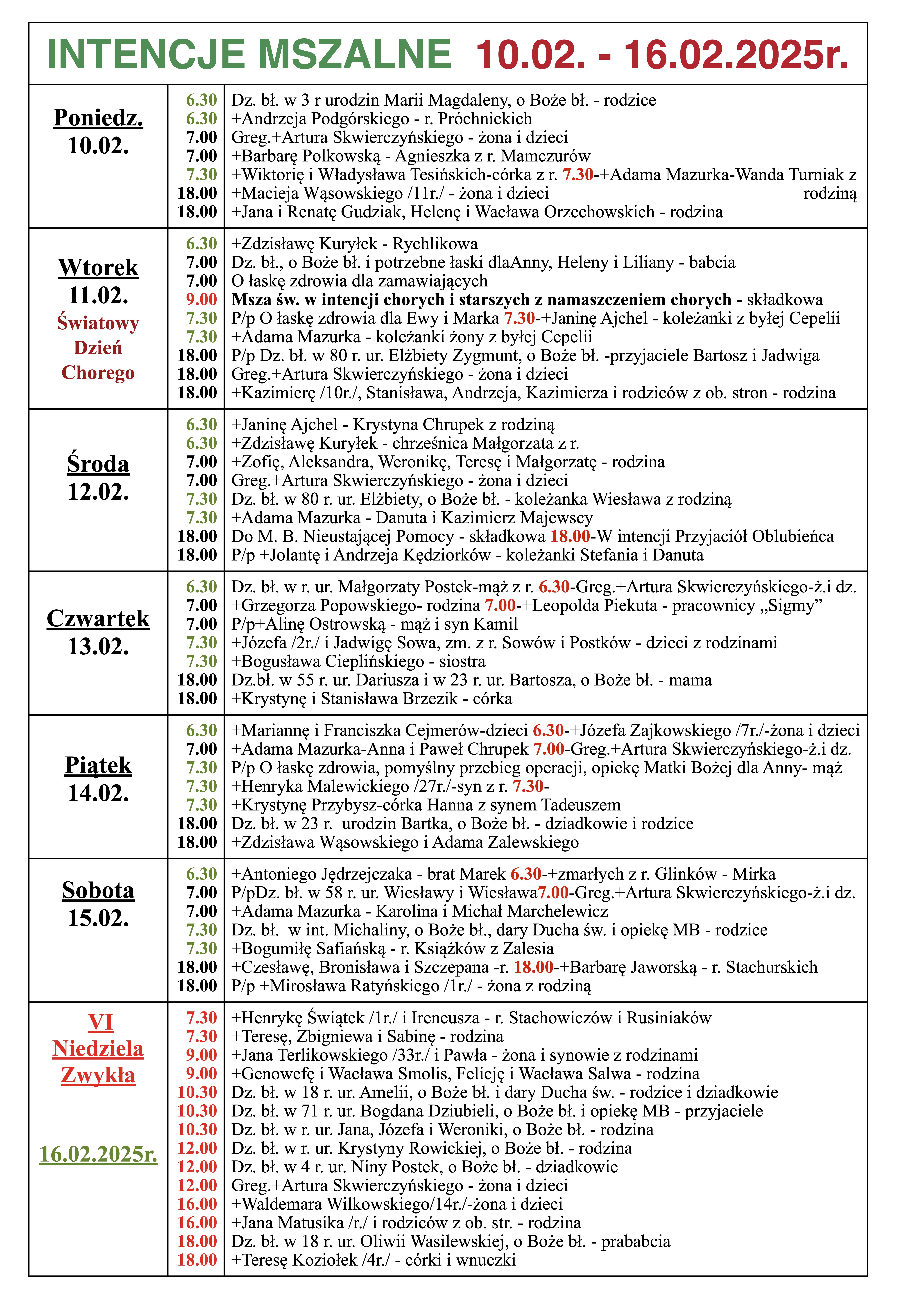 INTENCJE MSZALNE 10.02. – 16.02.2025r.