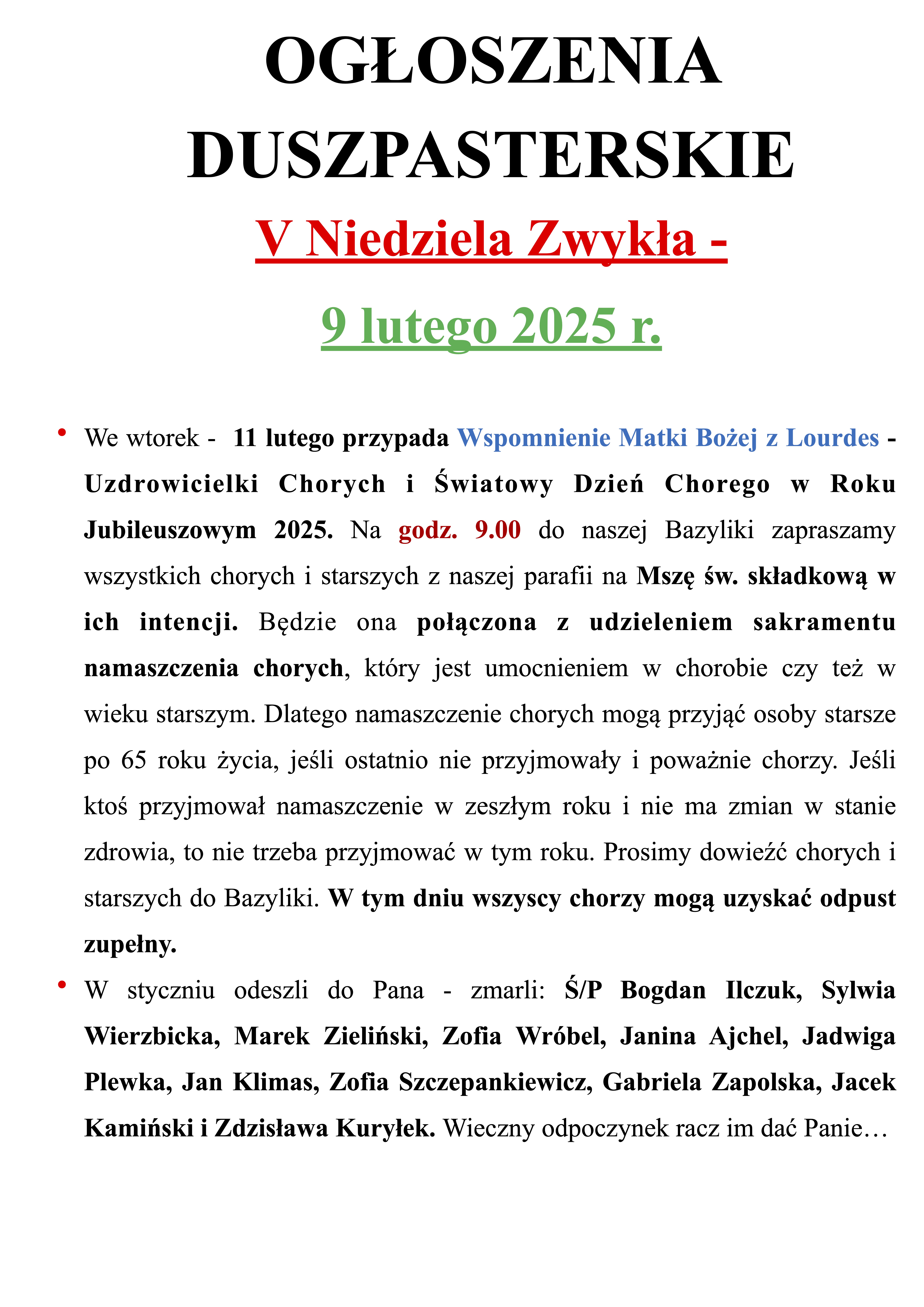INTENCJE MSZALNE 10.02. – 16.02.2025r.