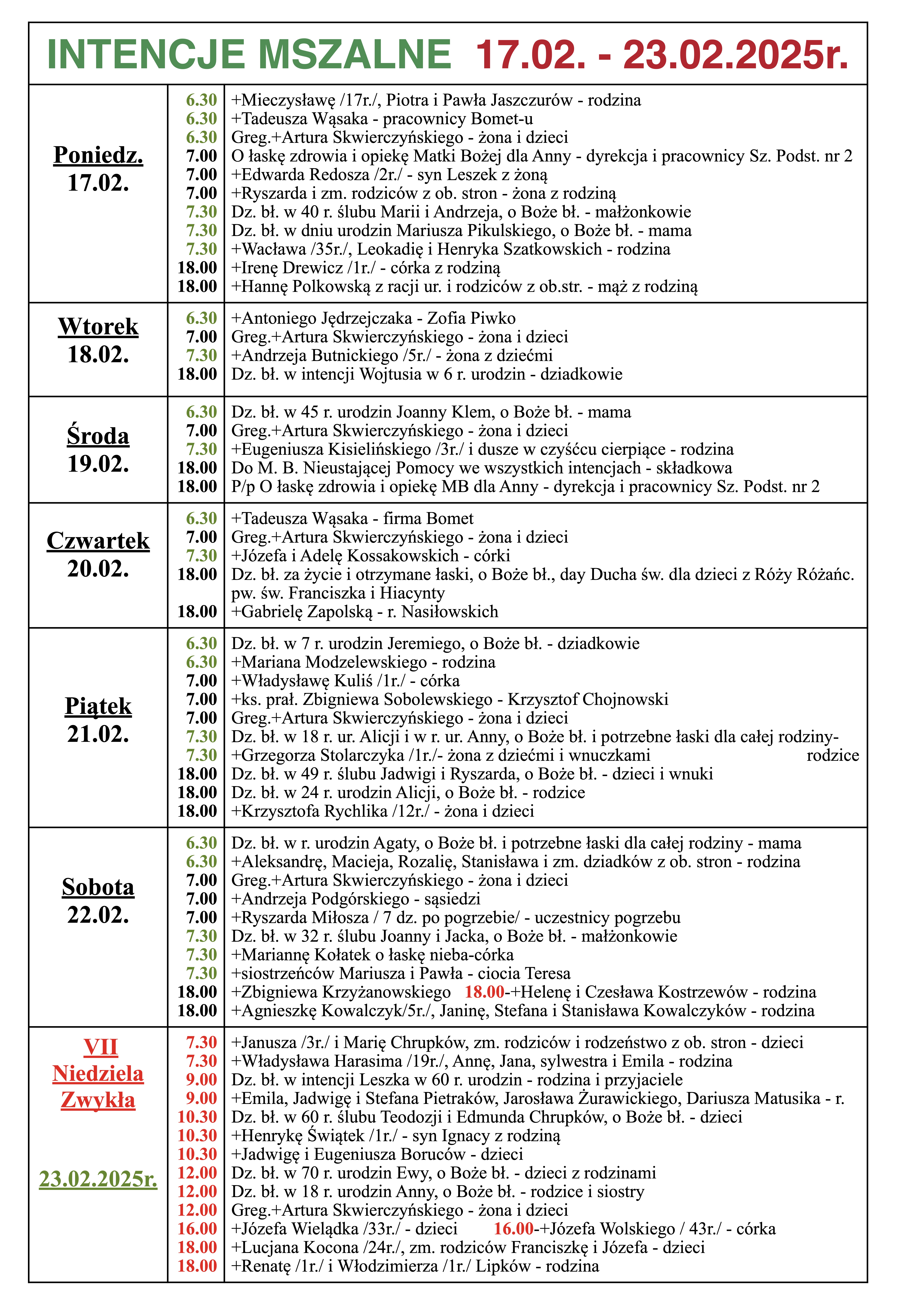 INTENCJE MSZALNE 17.02. – 23.02.2025r. przez Ks. Proboszcz / 9 miesięcy temu INTENCJE MSZALNE 17.02. – 23.02.2025r.