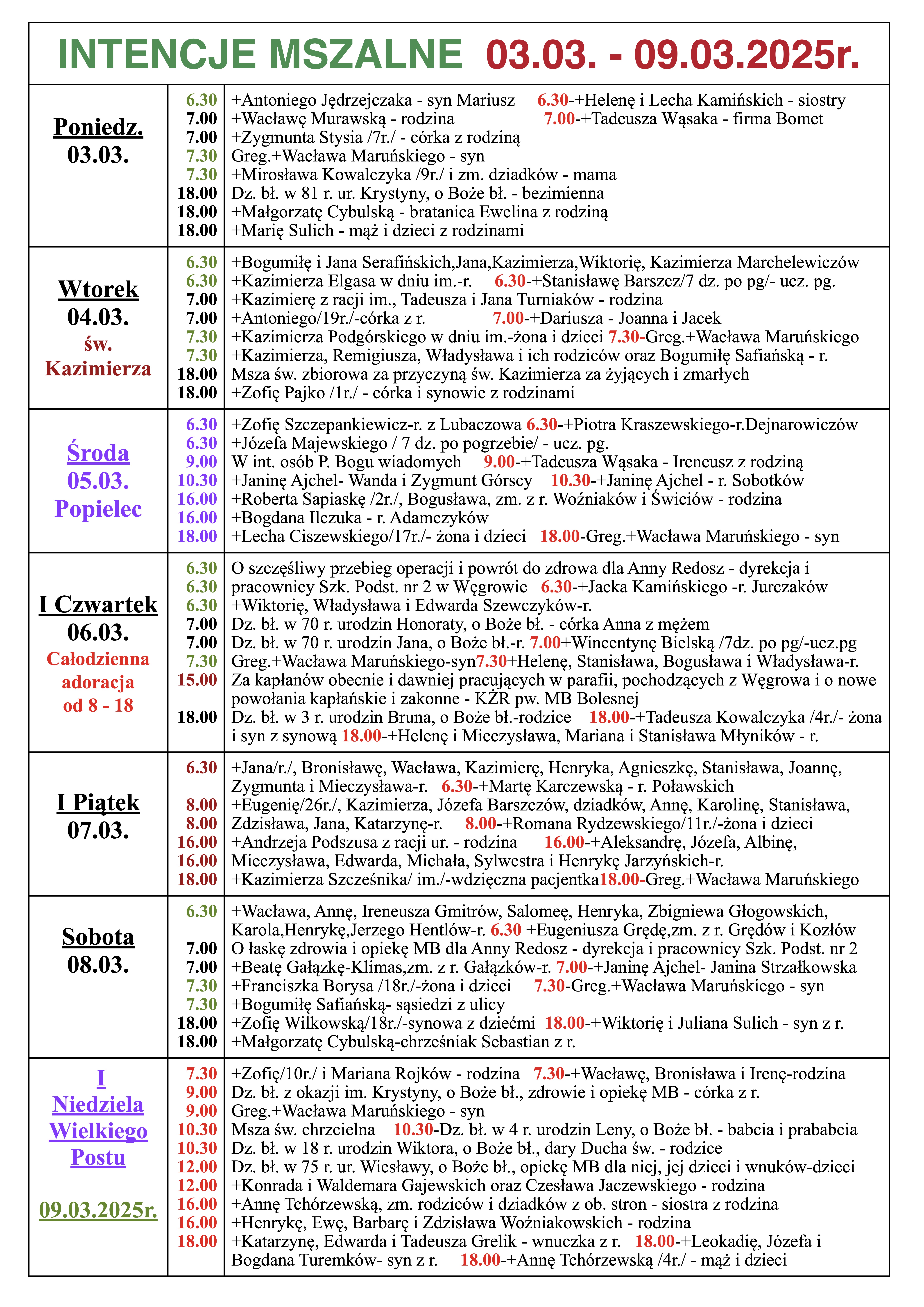INTENCJE MSZALNE 03.03. – 09.03.2025r.