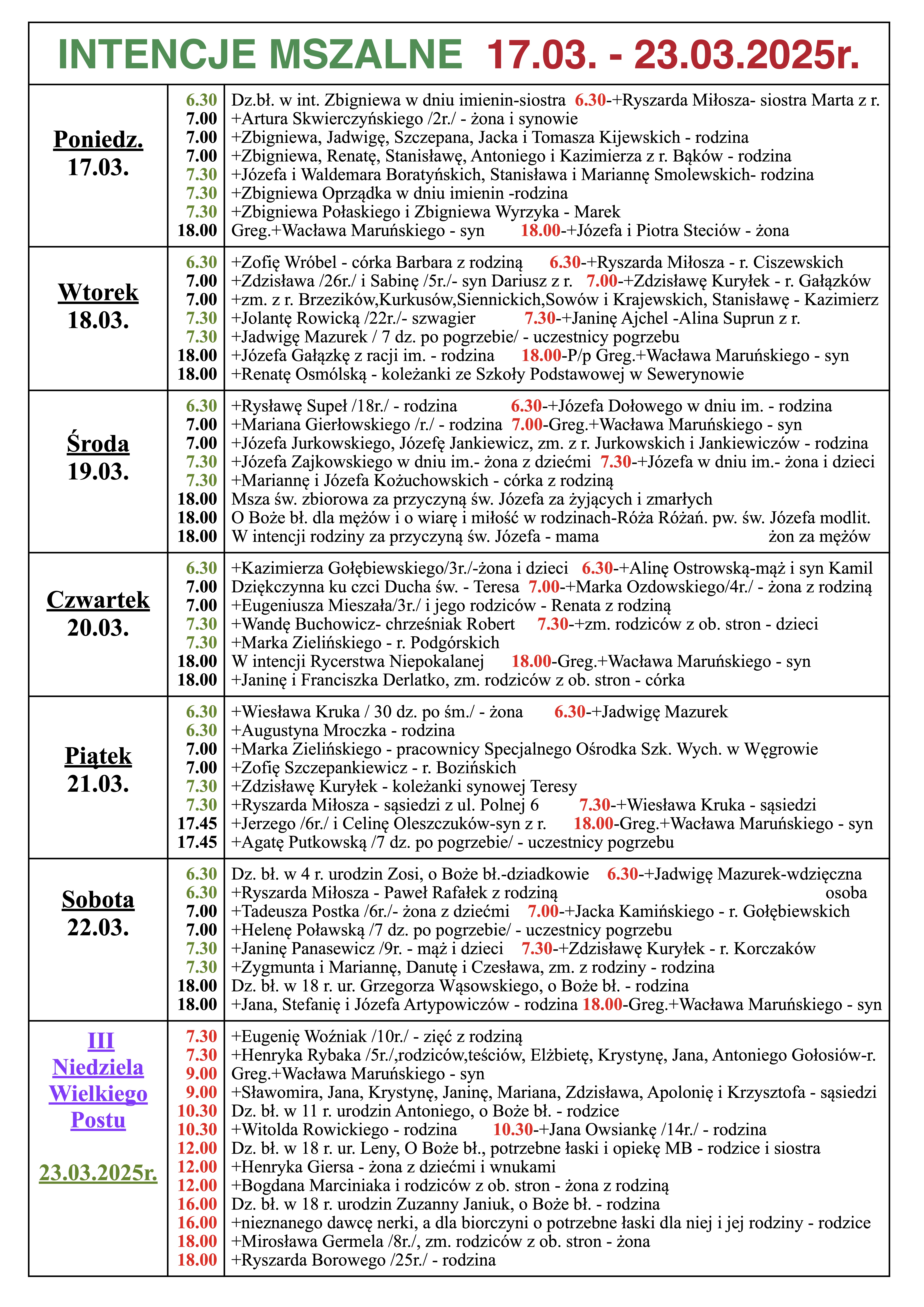 INTENCJE MSZALNE 17.03. – 23.03.2025r.