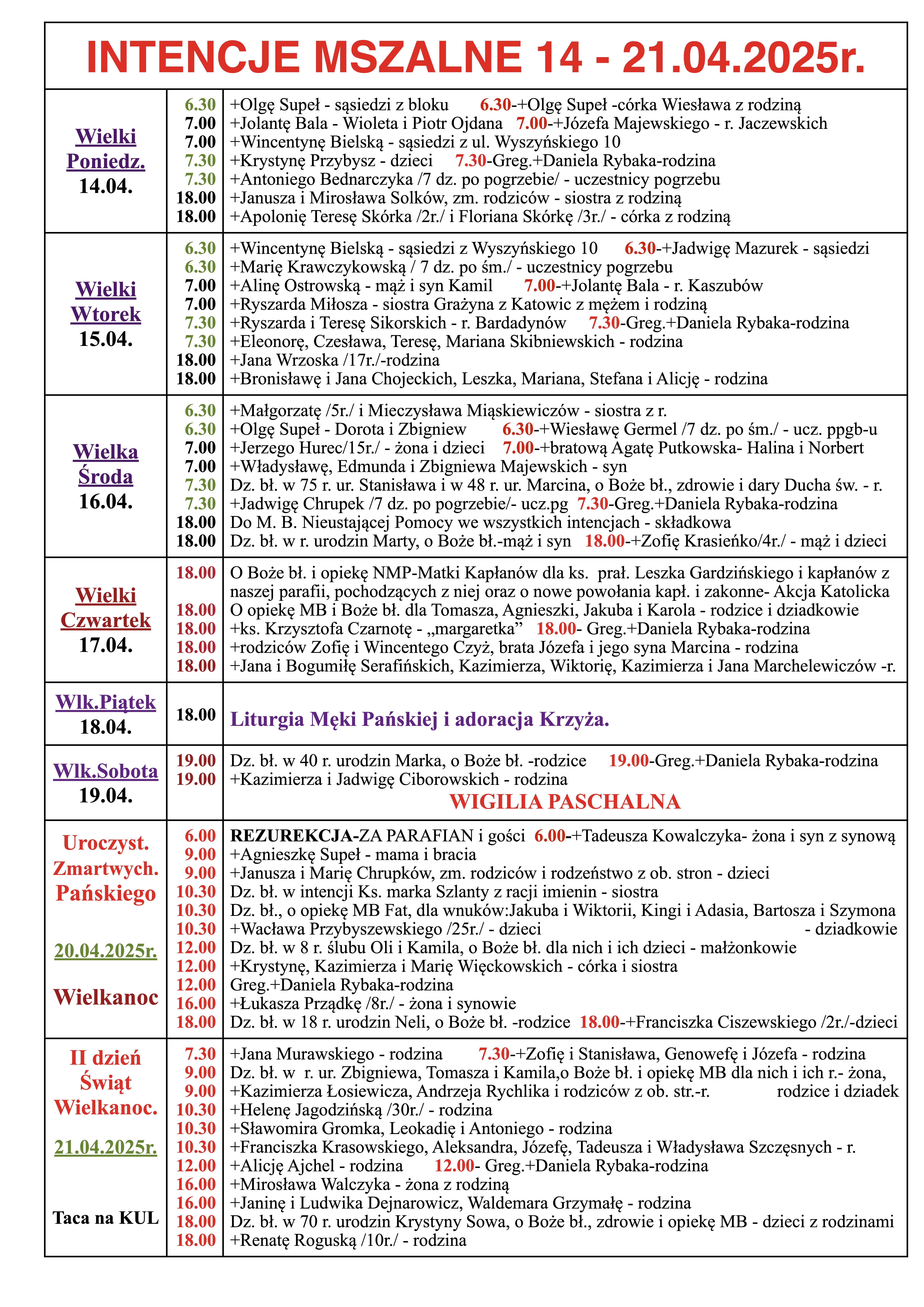 INTENCJE MSZALNE 14 – 21.04.2025r.