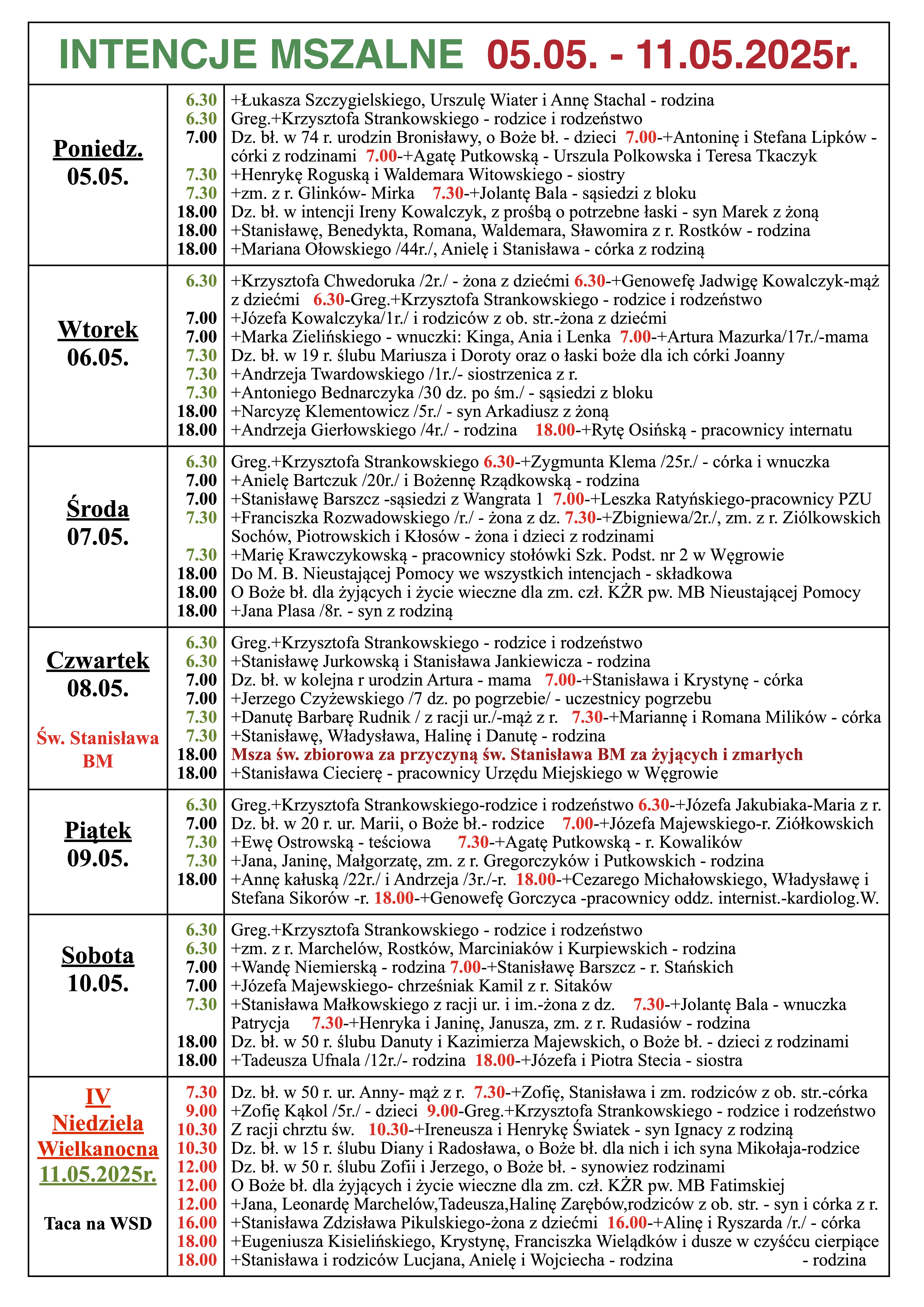 INTENCJE MSZALNE 05.05. – 11.05.2025r.