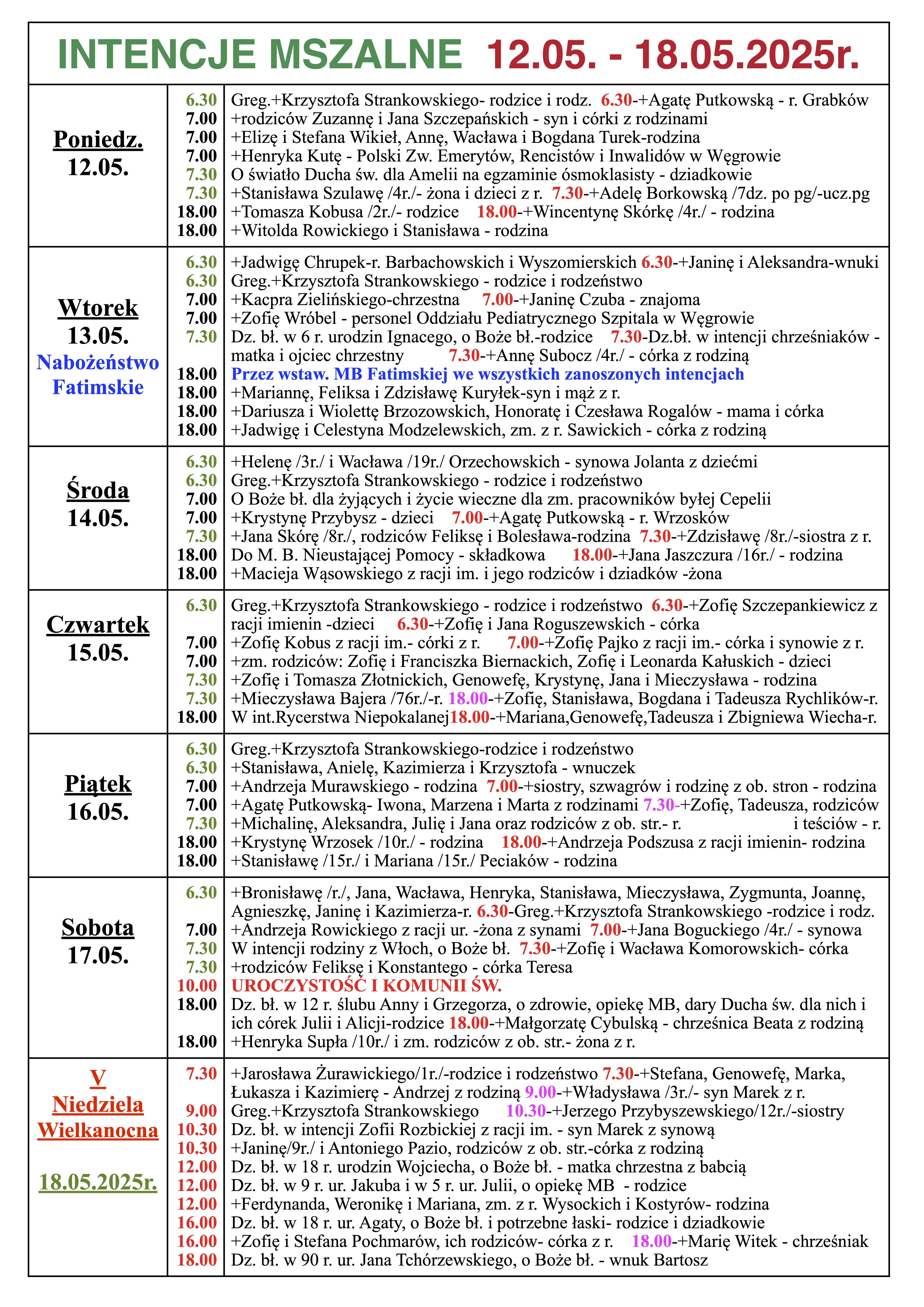 INTENCJE MSZALNE 12.05. – 18.05.2025r.
