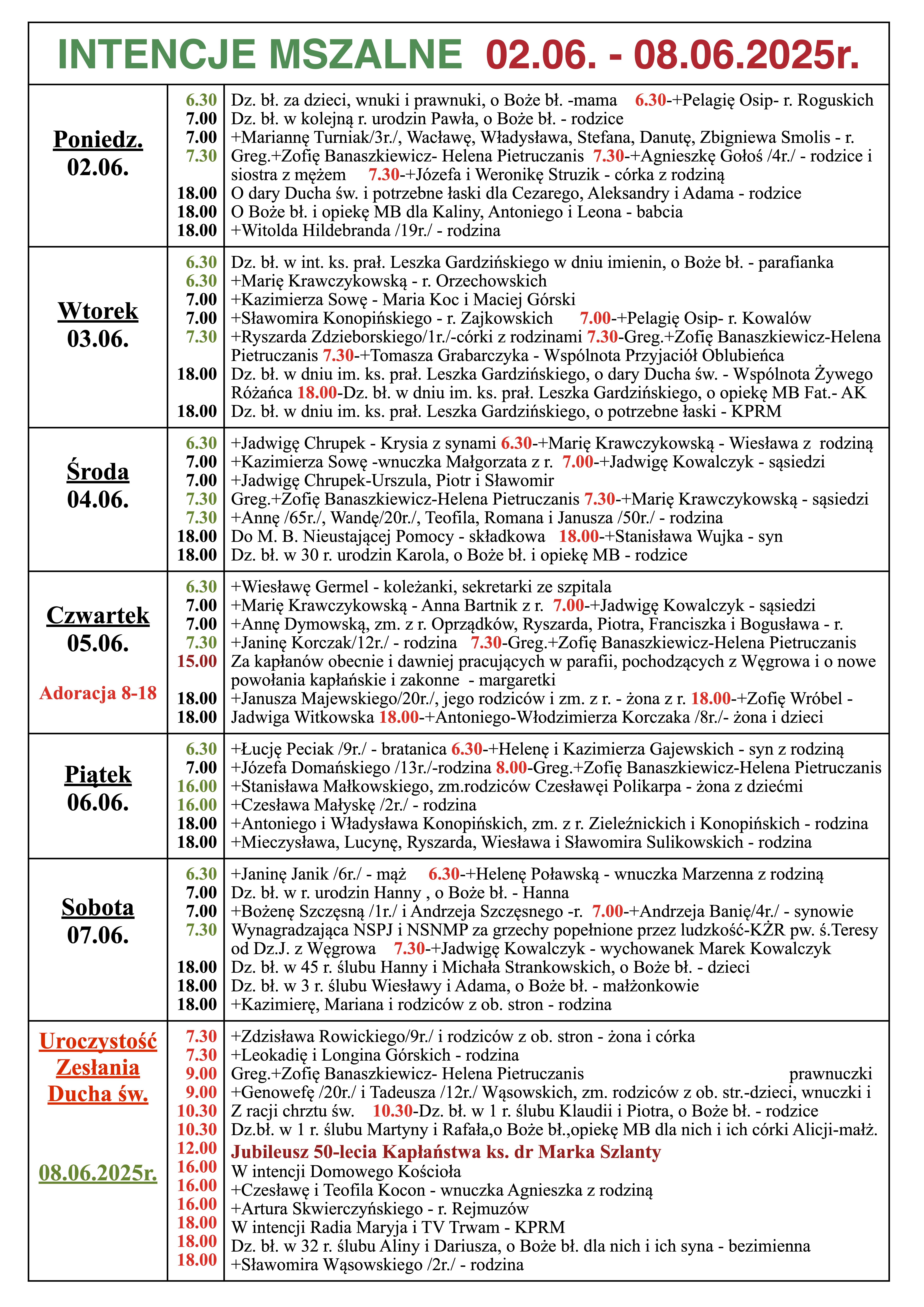 INTENCJE MSZALNE 02.06. – 08.06.2025r.