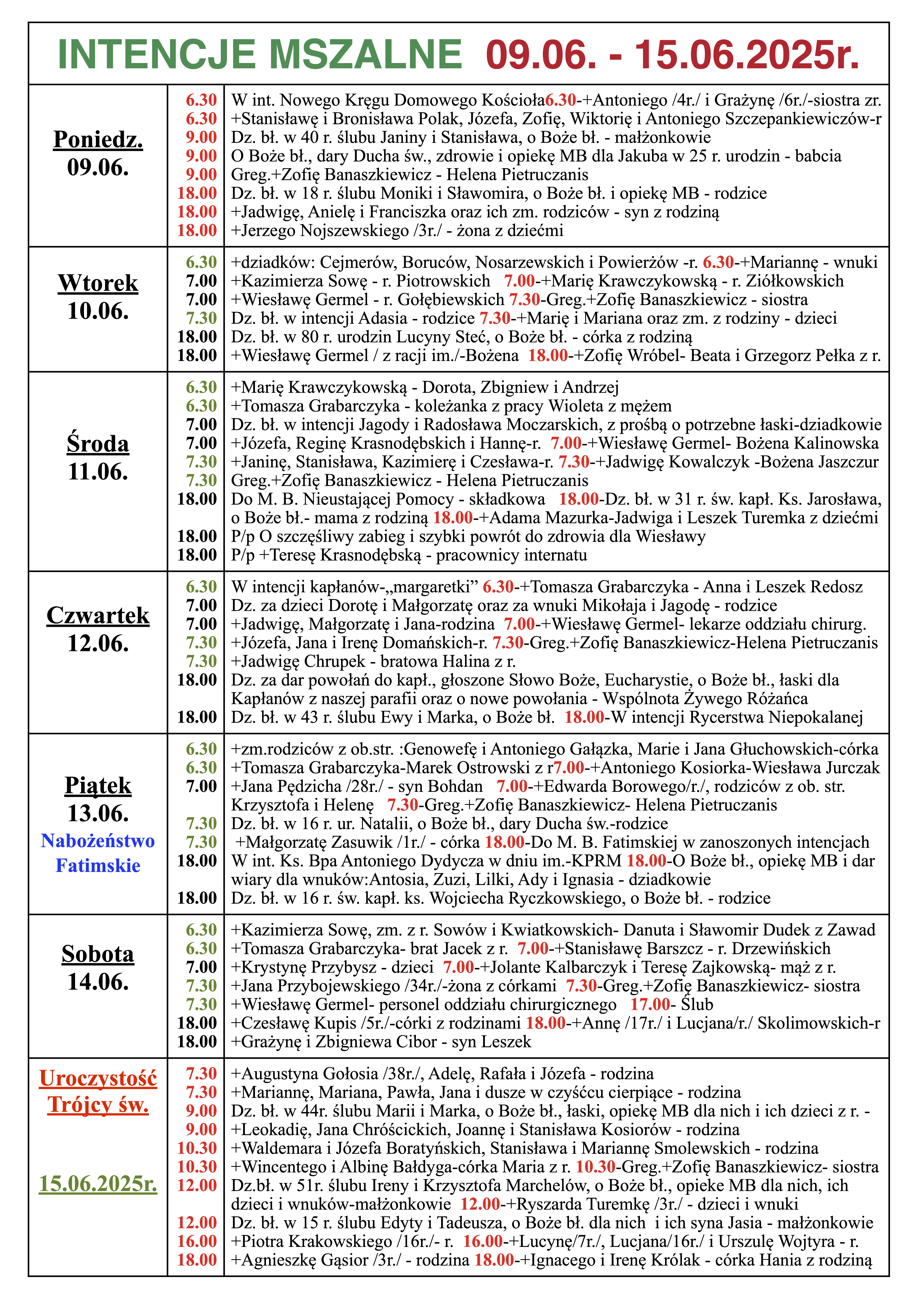INTENCJE MSZALNE 09.06. – 15.06.2025r.