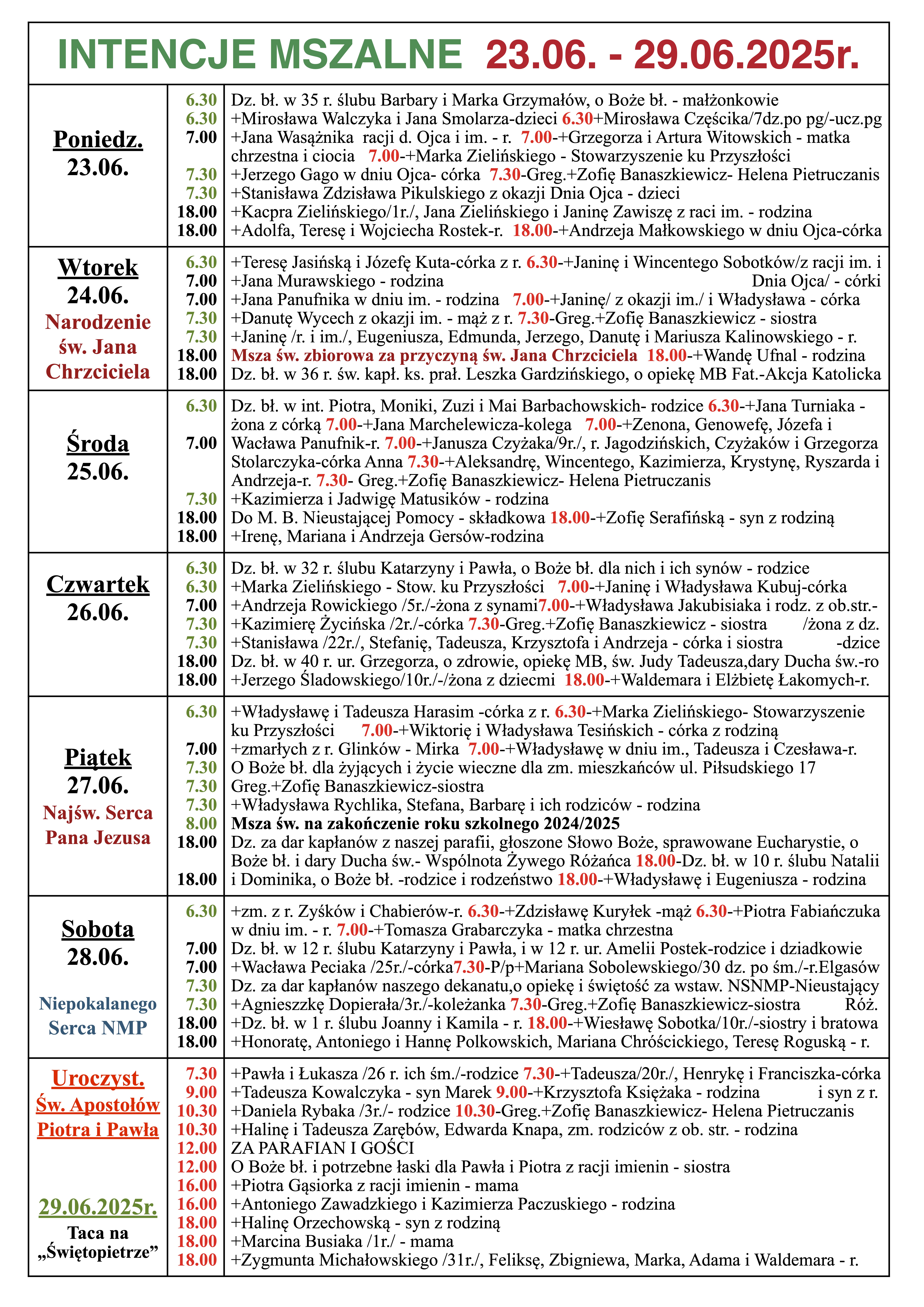 INTENCJE MSZALNE 23.06. – 29.06.2025r.