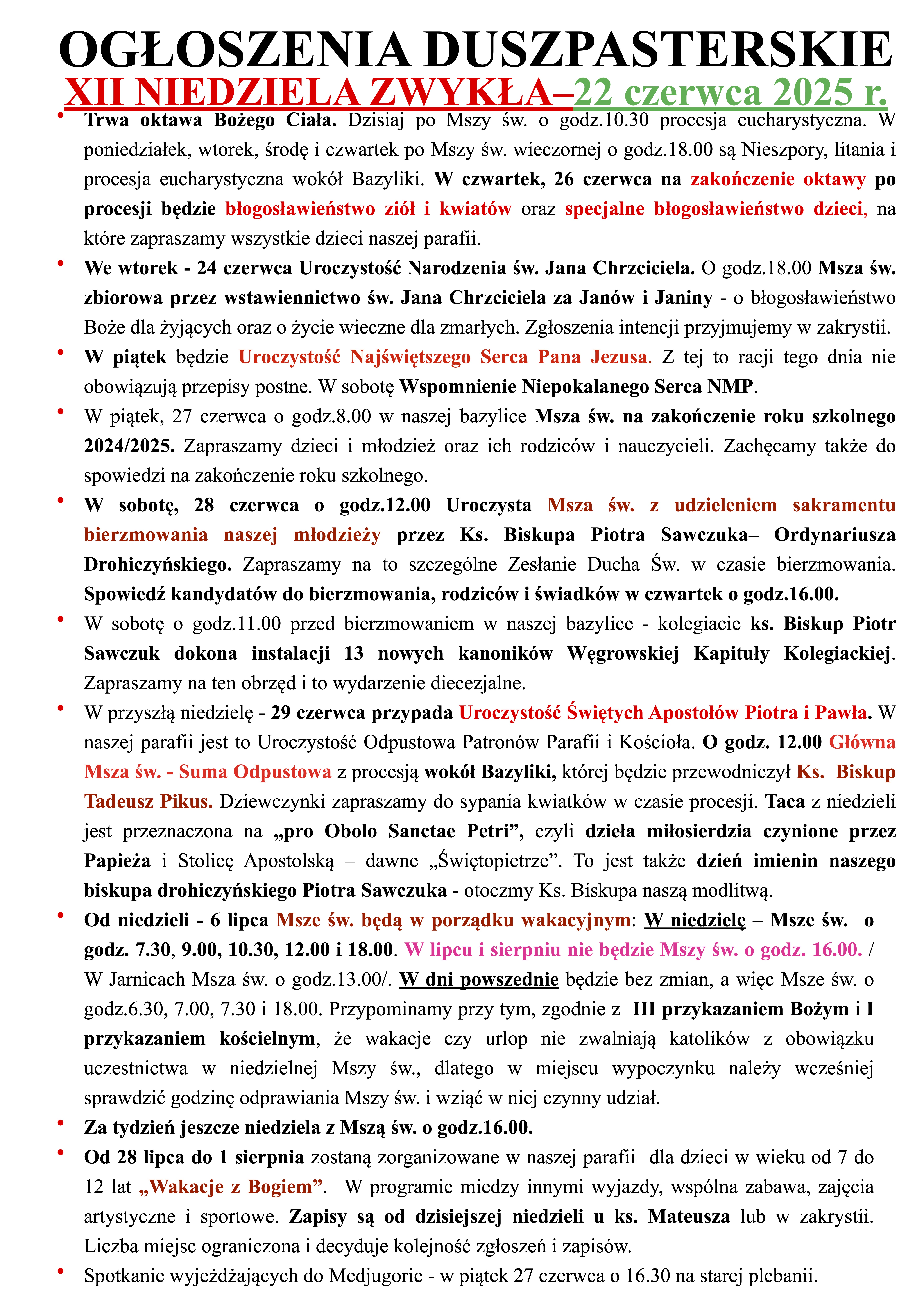 XII NIEDZIELA ZWYKŁA–22 czerwca 2025 r.