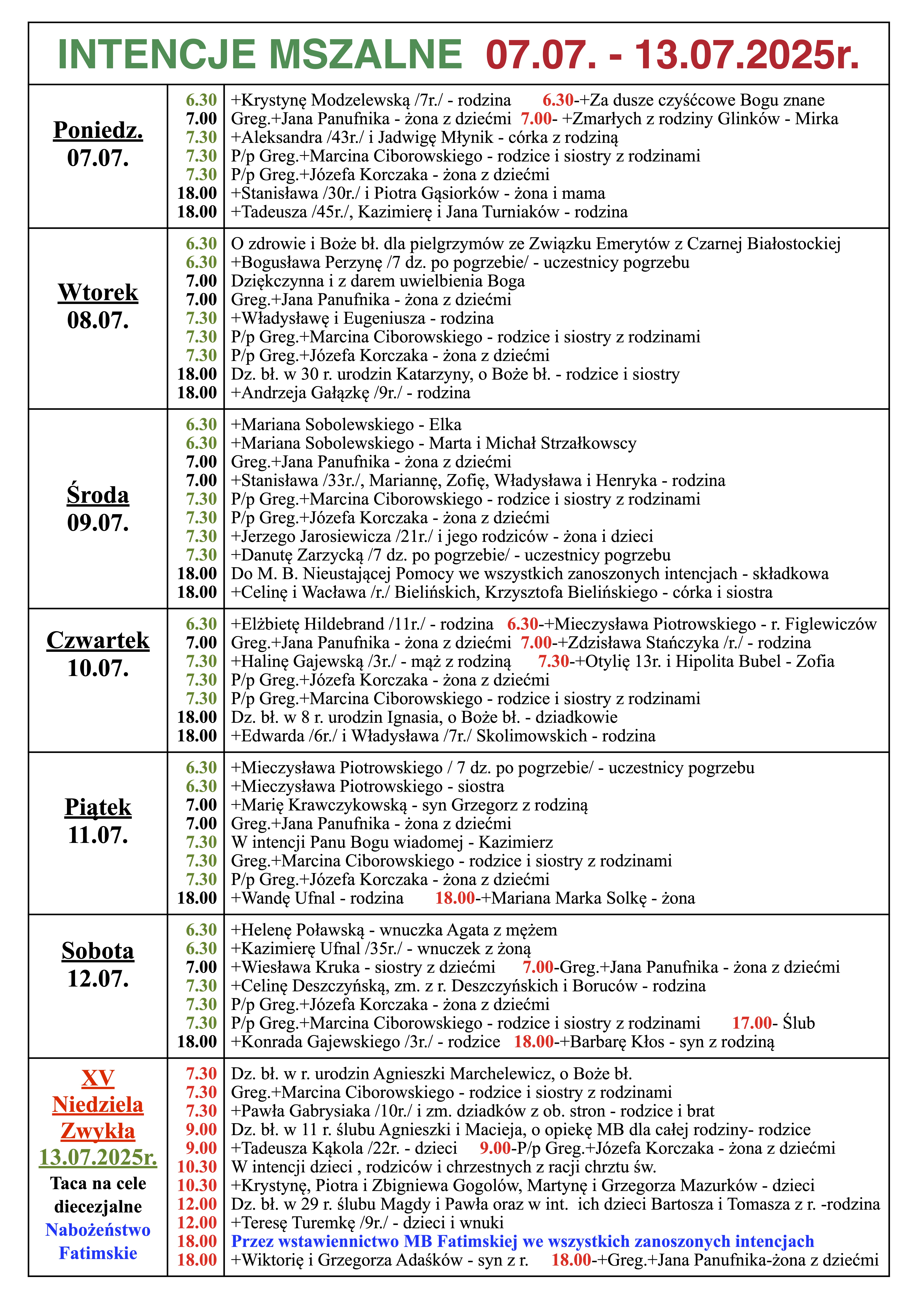 INTENCJE MSZALNE 07.07. – 13.07.2025r.