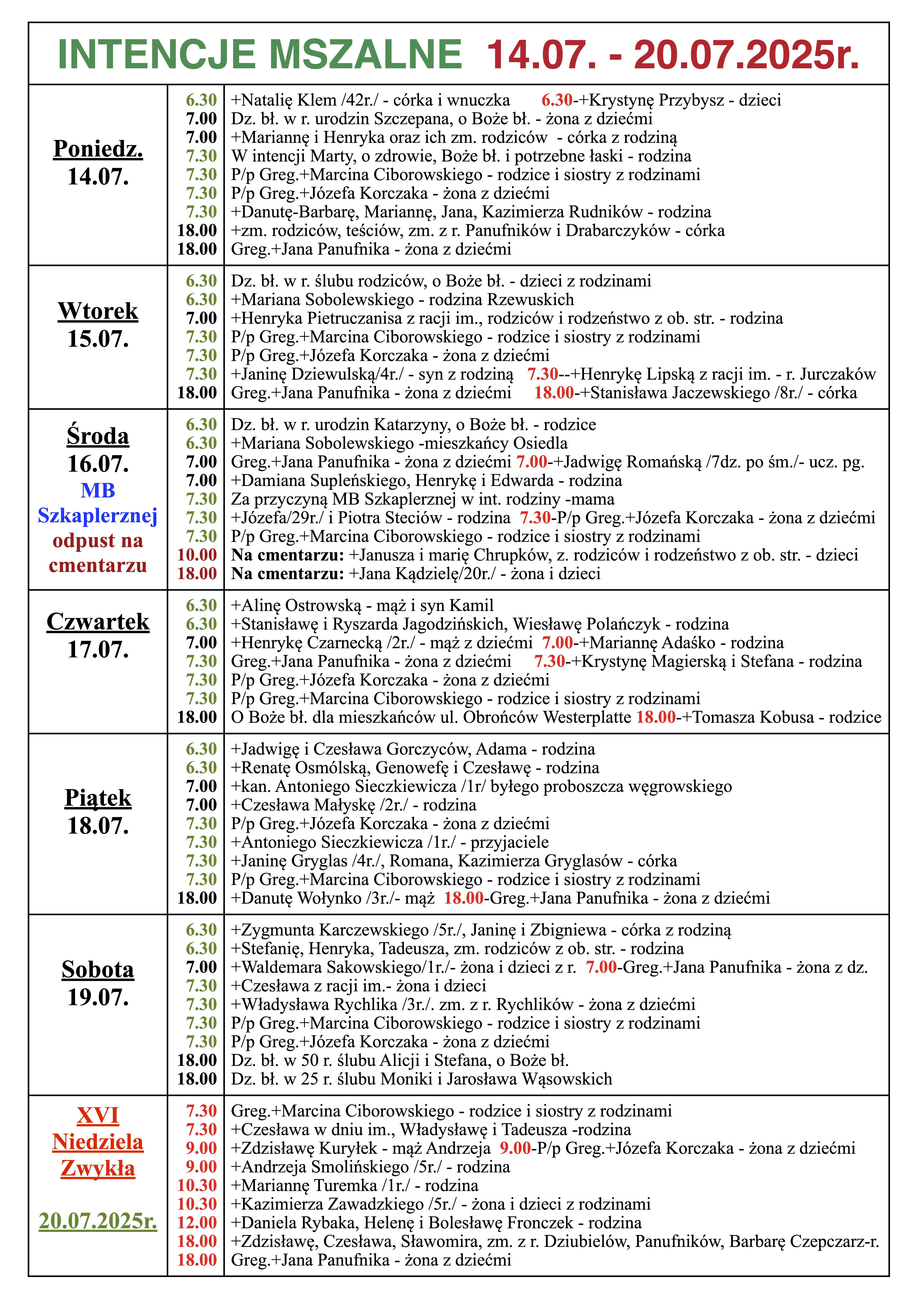 INTENCJE MSZALNE 14.07. – 20.07.2025r.