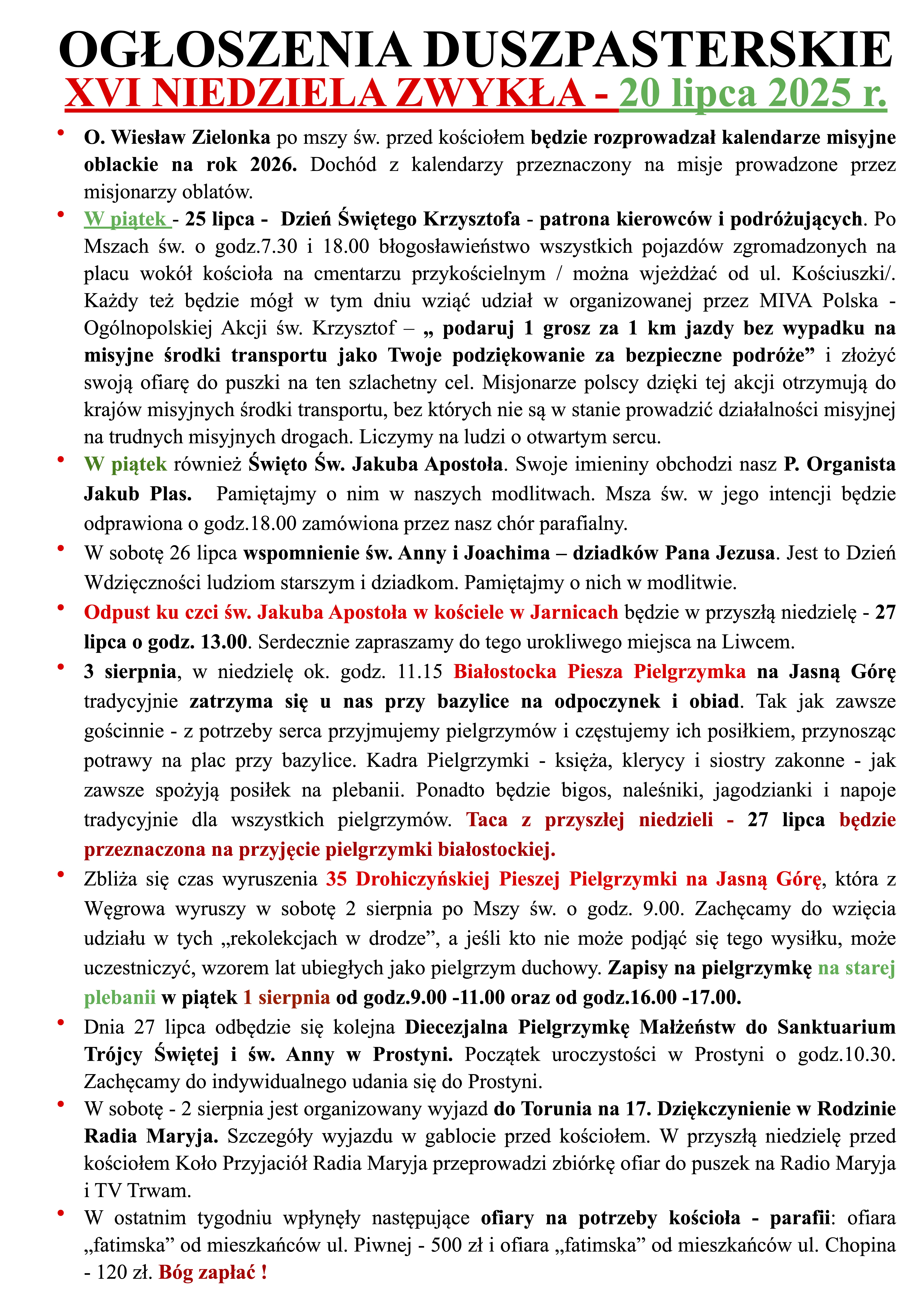 INTENCJE MSZALNE 21.07. – 27.07.2025r.