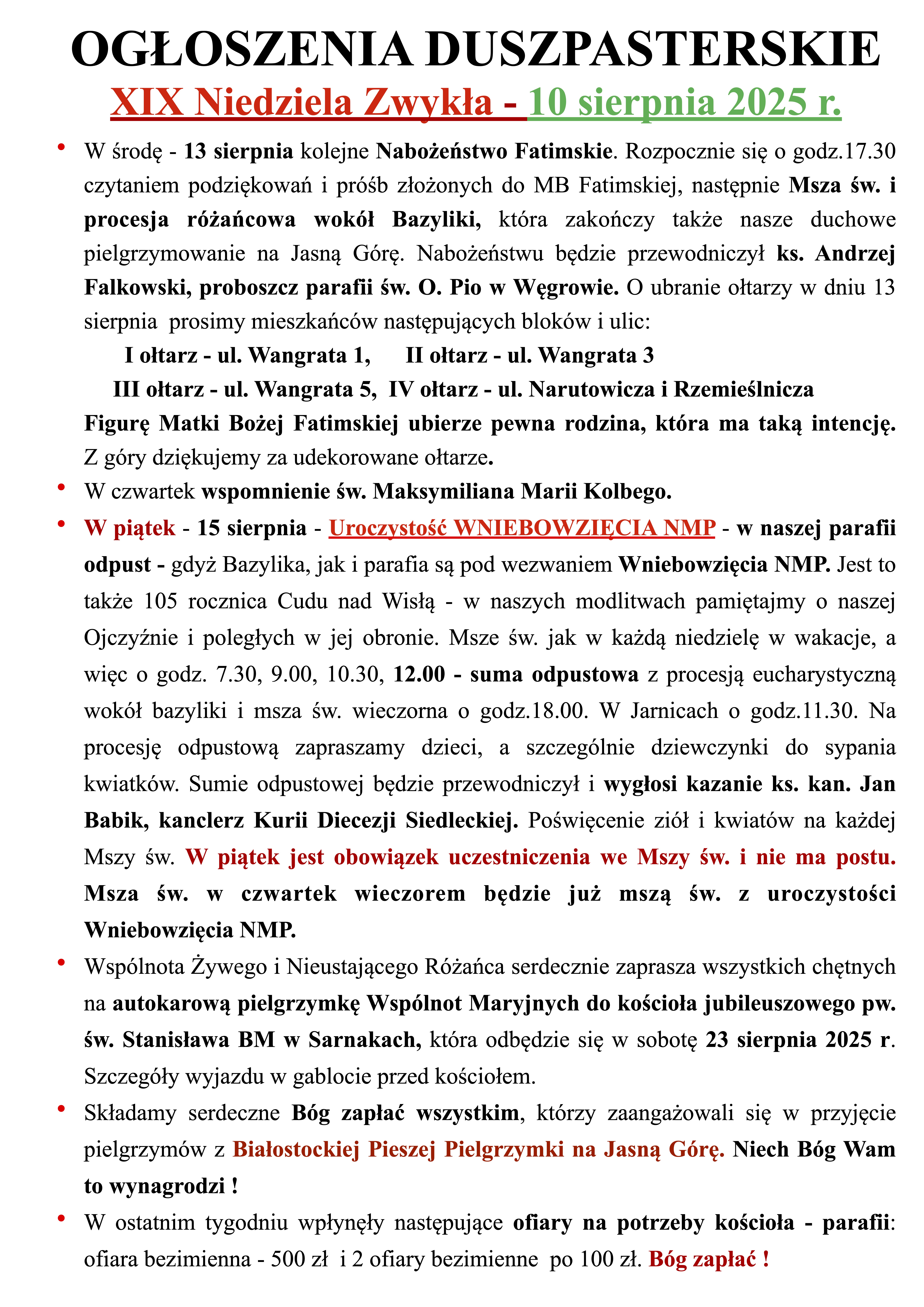 INTENCJE MSZALNE 17.08. – 24.08.2025r.