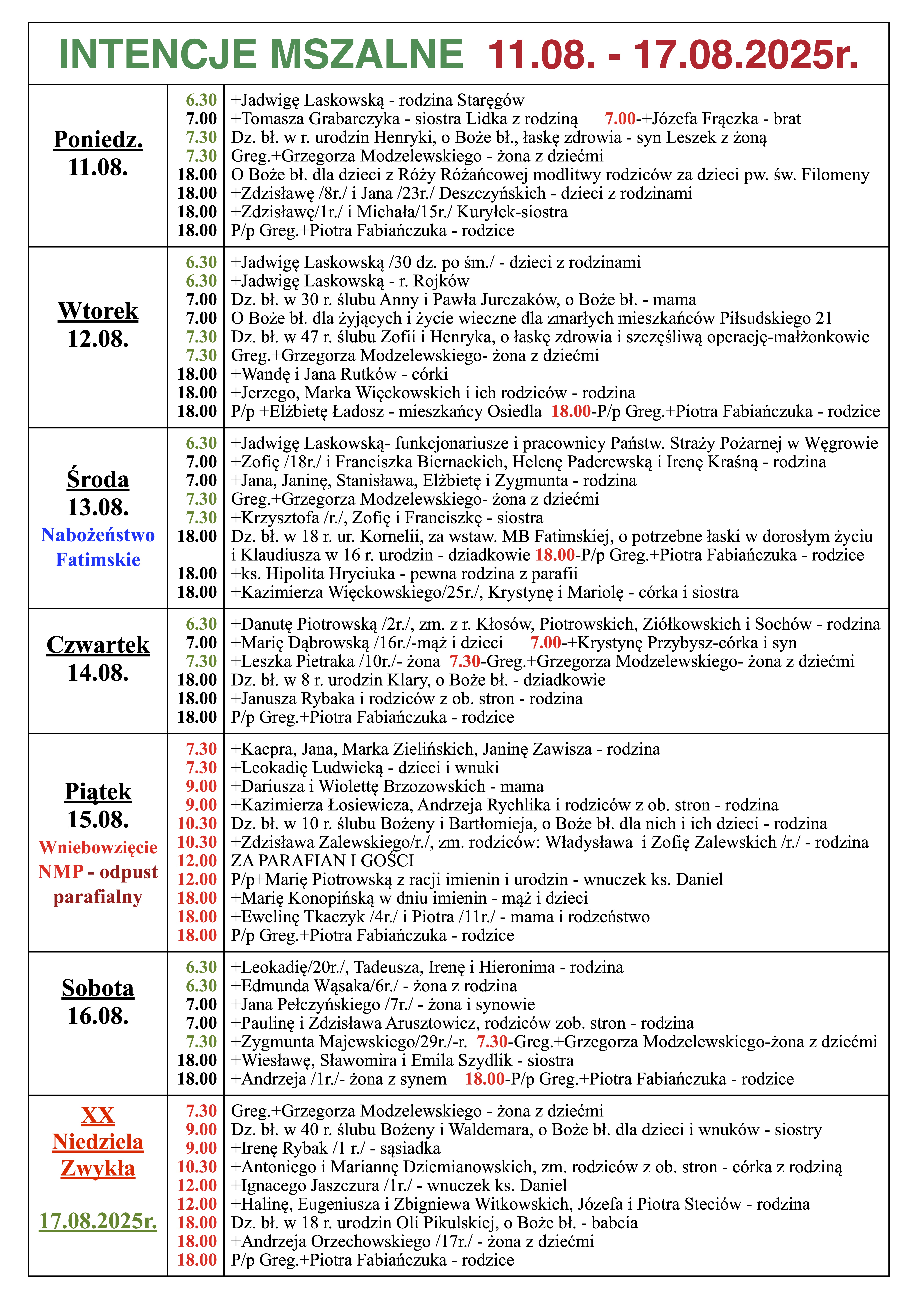 INTENCJE MSZALNE 11.08. – 17.08.2025r.
