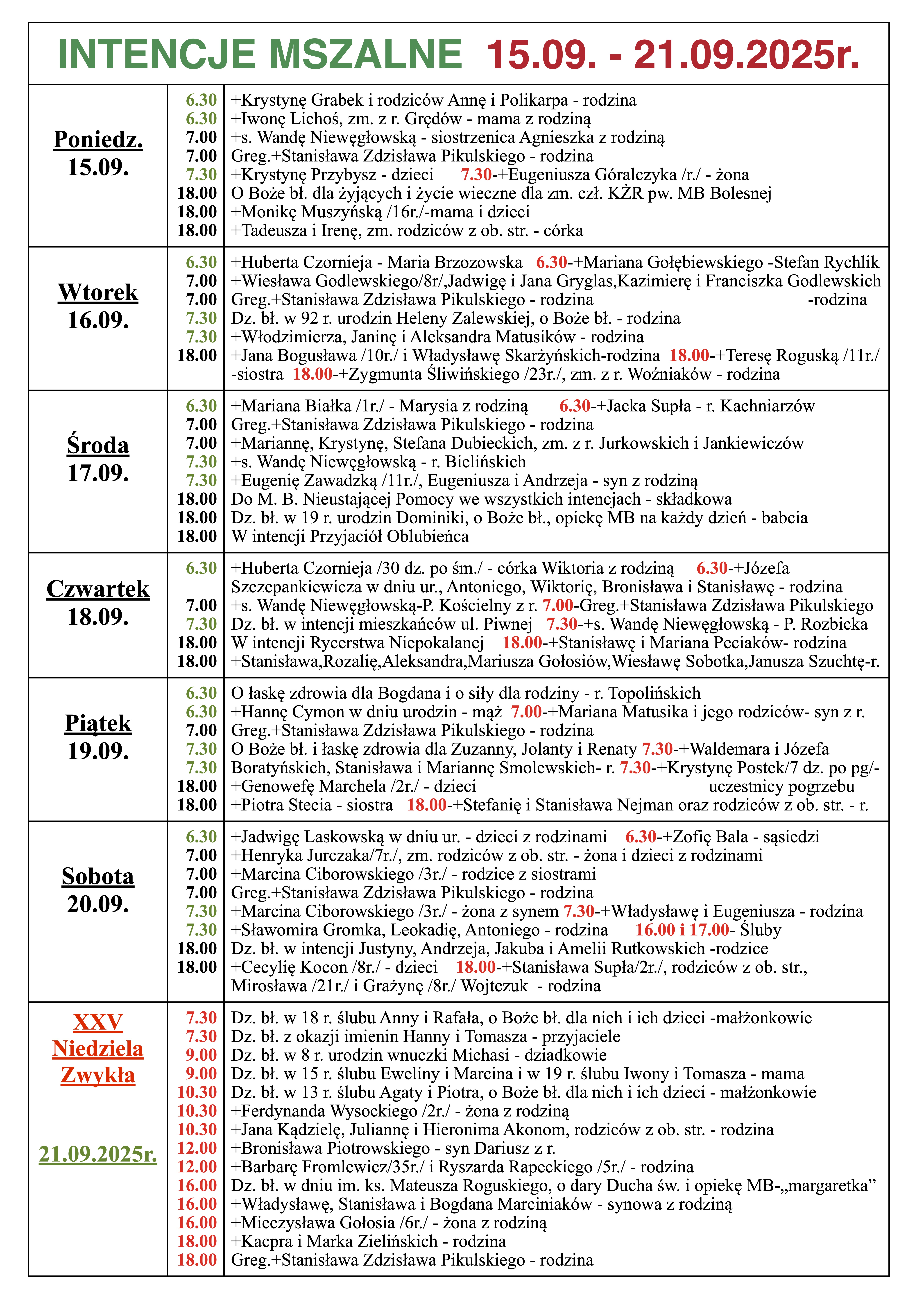 INTENCJE MSZALNE 15.09. – 21.09.2025r.
