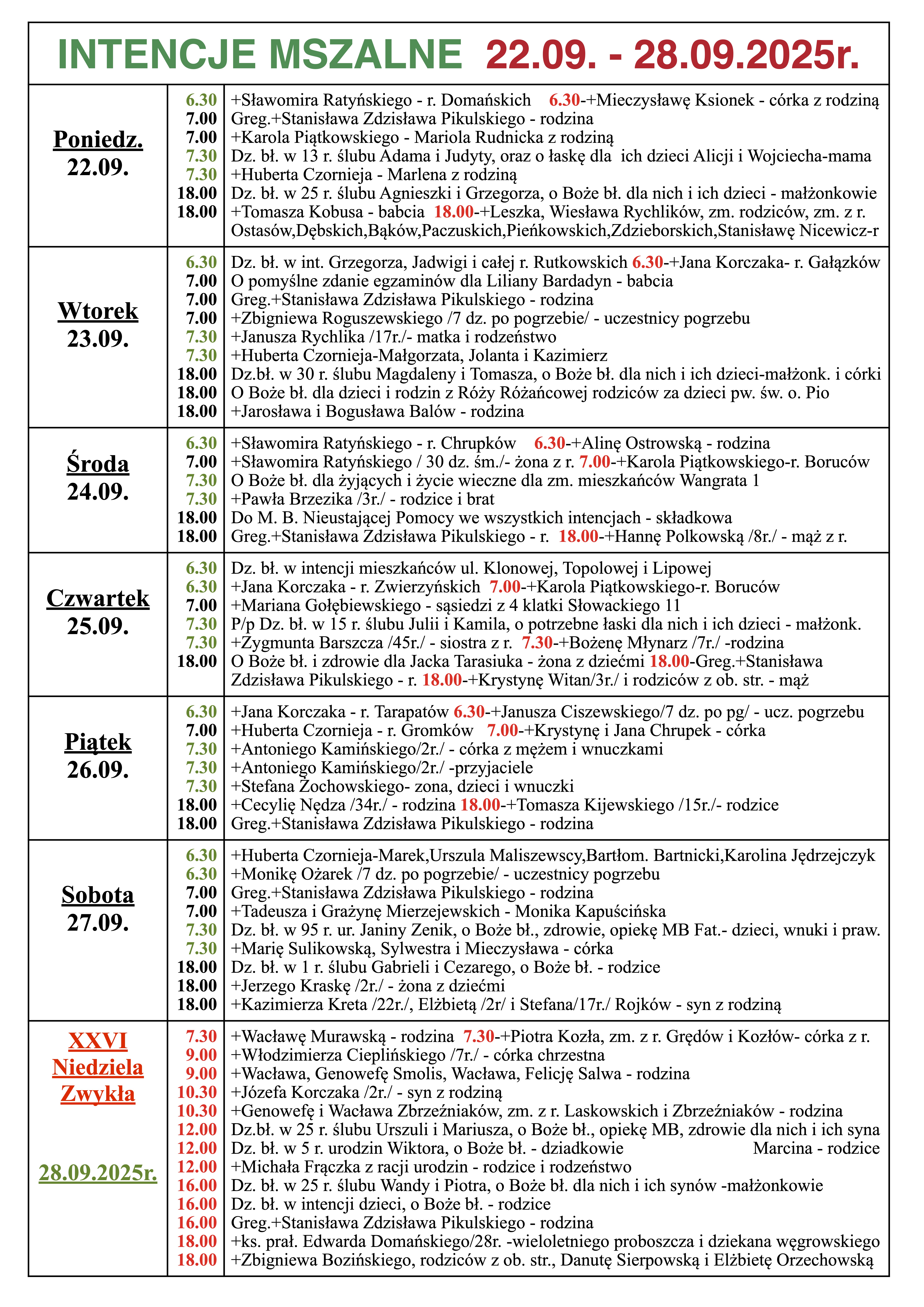 INTENCJE MSZALNE 22.09. – 28.09.2025r.