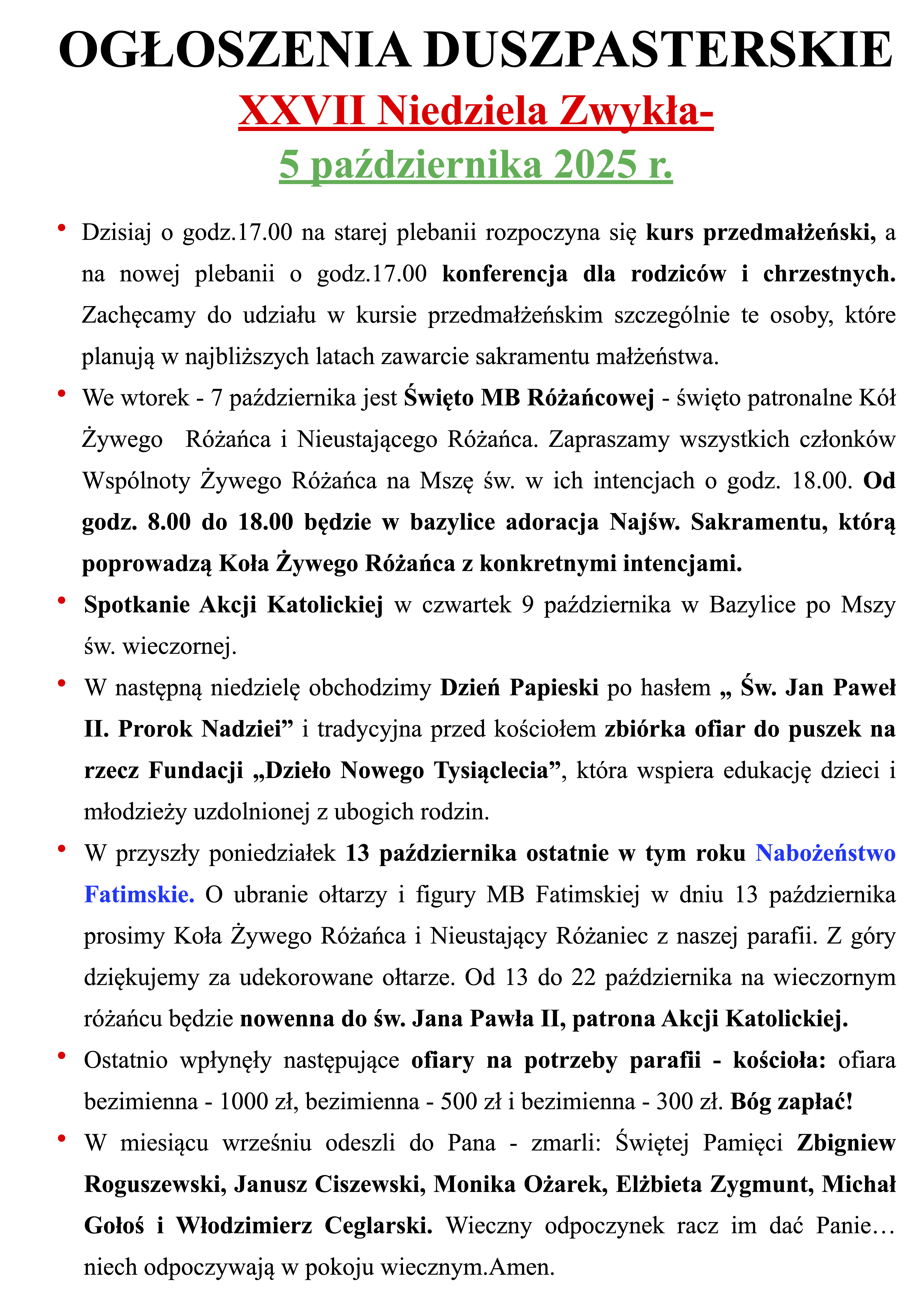 INTENCJE MSZALNE 06.10. – 12.10.2025r.