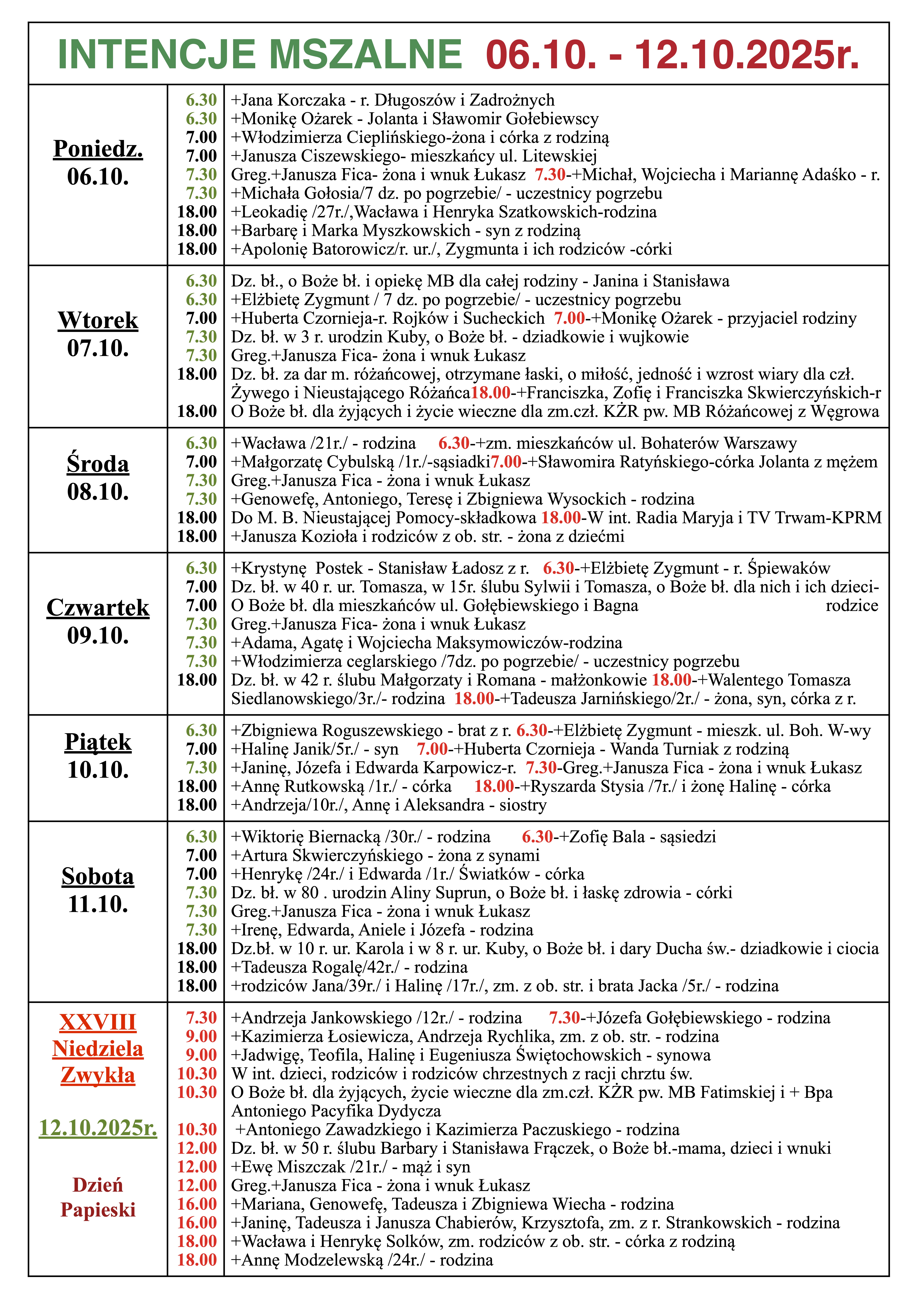 INTENCJE MSZALNE 06.10. – 12.10.2025r.