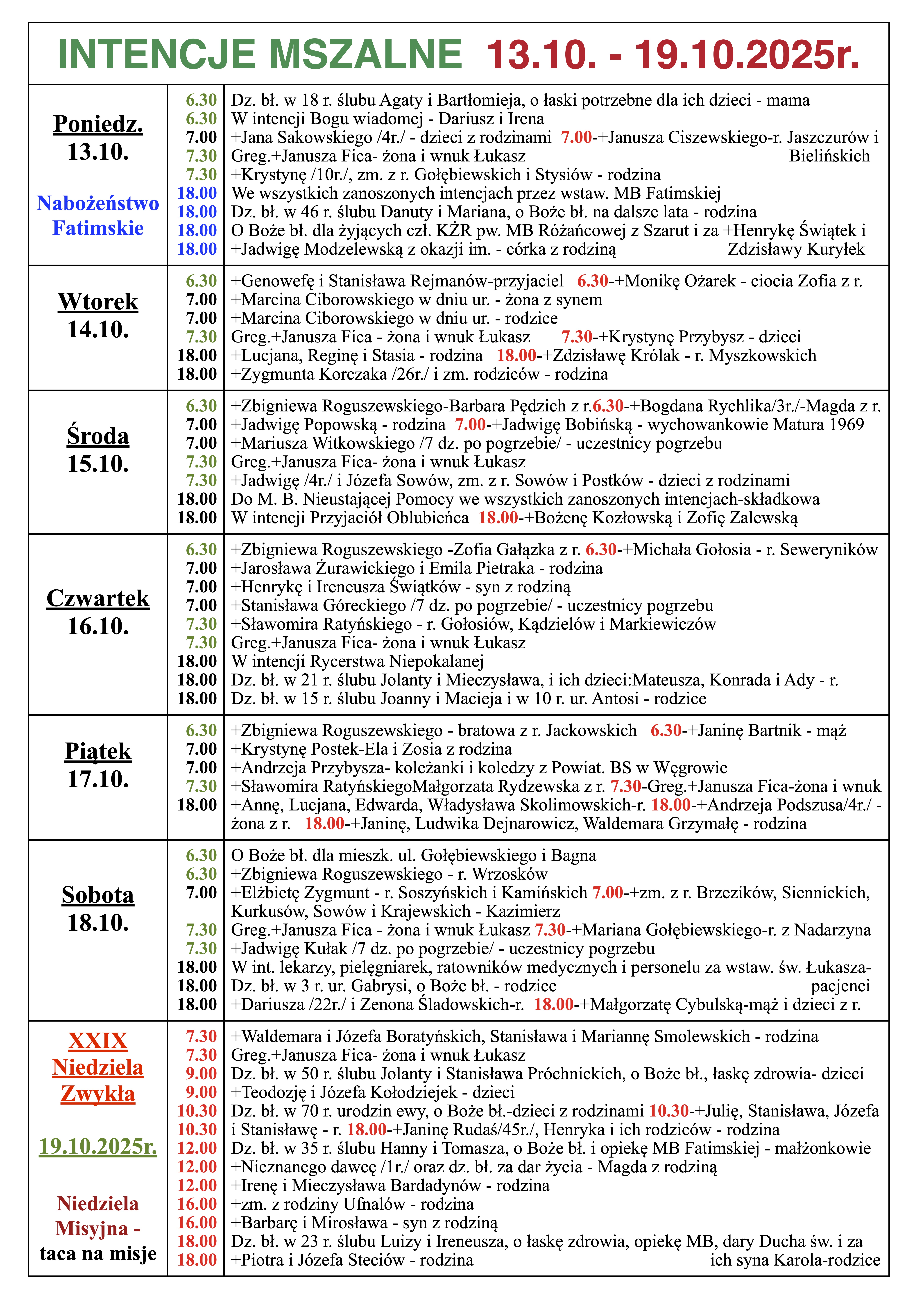INTENCJE MSZALNE 13.10. – 19.10.2025r.