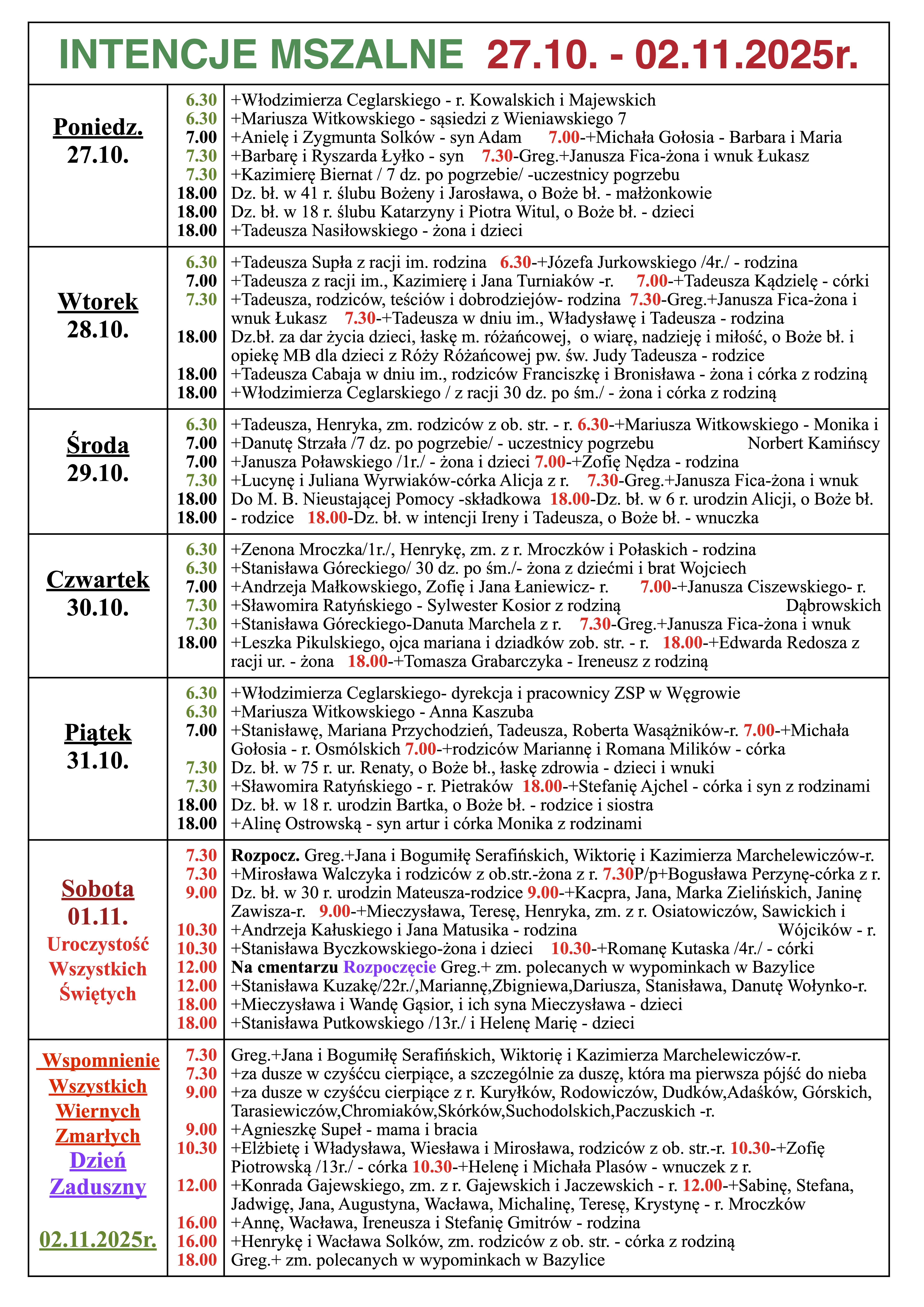 INTENCJE MSZALNE 27.10. – 02.11.2025r.